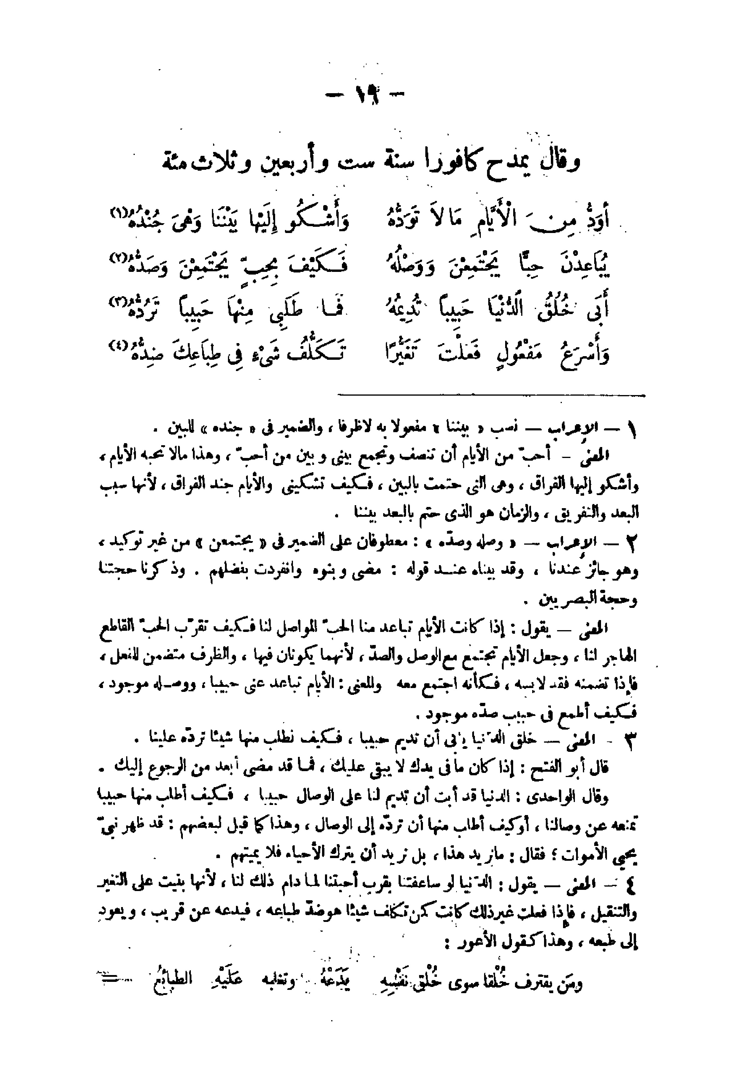 3 - الْمَعْنى خلق الدُّنْيَا يَأْبَى أَن تديم حبيبا فَكيف نطلب مِنْهَا شَيْئا ترده علينا قَالَ أَبُو الْفَتْح إِذا كَانَ مَا فى يدك لَا يبْقى عَلَيْك فَمَا قد مضى أبعد من الرُّجُوع إِلَيْك وَقَالَ الواحدى الدُّنْيَا قد أَبَت أَن تديم لنا على الْوِصَال حبيبا فَكيف أطلب مِنْهَا حبيبا تَمنعهُ عَن وصالنا أَو كَيفَ أطلب مِنْهَا أَن ترده إِلَى الْوِصَال وَهَذَا كَمَا قيل لبَعْضهِم قد ظهر نبى يحيى الْأَمْوَات فَقَالَ مَا نُرِيد هَذَا بل نُرِيد أَن يتْرك الْأَحْيَاء فَلَا يميتهم