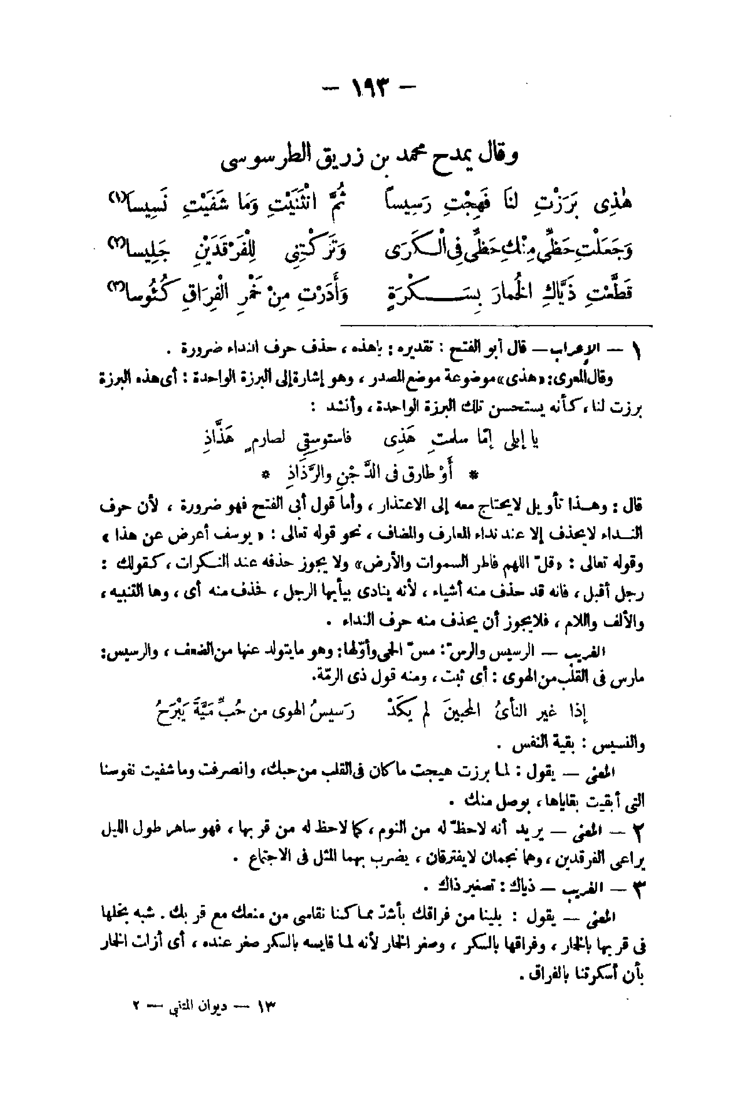 قَالَ وَهَذَا تَأْوِيل لَا يحْتَاج مَعَه إِلَى الِاعْتِذَار وَأما قَول أَبى الْفَتْح فَهُوَ ضَرُورَة لِأَن حرف النداء لَا يحذف إِلَّا عِنْد نِدَاء المعارف والمضاف نَحْو قَوْله تَعَالَى {يُوسُف أعرض عَن هَذَا} وَقَوله تَعَالَى {قل اللَّهُمَّ فاطر السَّمَاوَات وَالْأَرْض} وَلَا يجوز حذفه عِنْد النكرات كَقَوْلِك رجل أقبل فَإِنَّهُ قد حذف مِنْهُ أَشْيَاء لِأَنَّهُ يُنَادى بيأيها الرجل فَحذف مِنْهُ أى وَهَا التَّنْبِيه وَالْألف وَاللَّام فَلَا يجوز أَن يحذف مِنْهُ حرف النداء الْغَرِيب الرسيس والرس مس الْحمى وأولها وَهُوَ مَا يتَوَلَّد عَنْهَا من الضعْف والرسيس مارس فى الْقلب من الْهوى أى ثَبت وَمِنْه قَول ذى المرمة