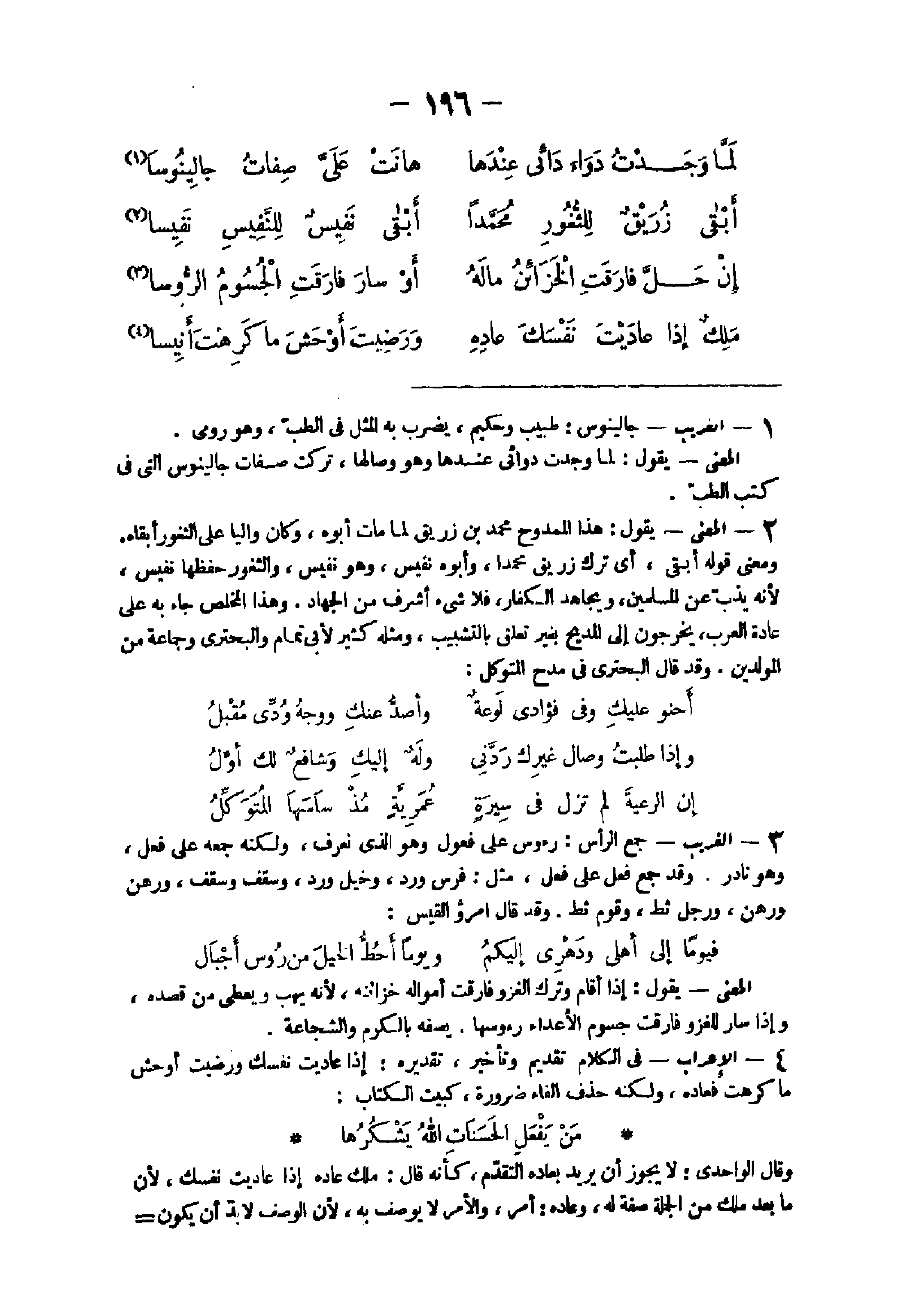 - الْغَرِيب جالينوس طَبِيب وَحَكِيم يضْرب بِهِ الْمثل فى الطِّبّ وَهُوَ رومى الْمَعْنى يَقُول لما وجدت دوائى عِنْدهَا وَهُوَ وصالها تركت صِفَات جالينوس الَّتِى فى كتب الطِّبّ