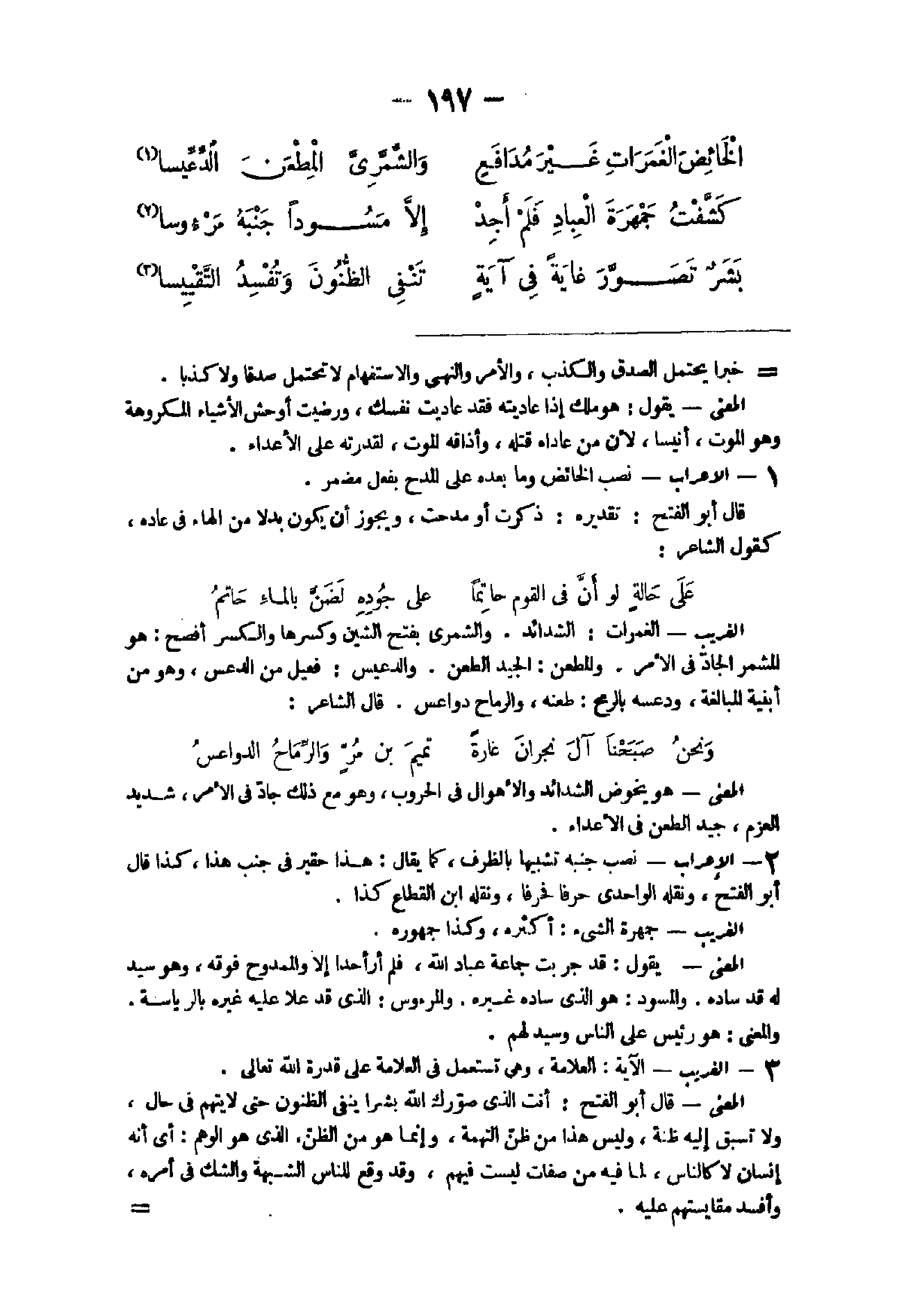 - الْإِعْرَاب نصب الخائض وَمَا بعده على الْمَدْح بِفعل مُضْمر قَالَ أَبُو الْفَتْح تَقْدِيره ذكرت أَو مدحت وَيجوز أَن يكون بَدَلا من الْهَاء فى عَاده كَقَوْل الشَّاعِر