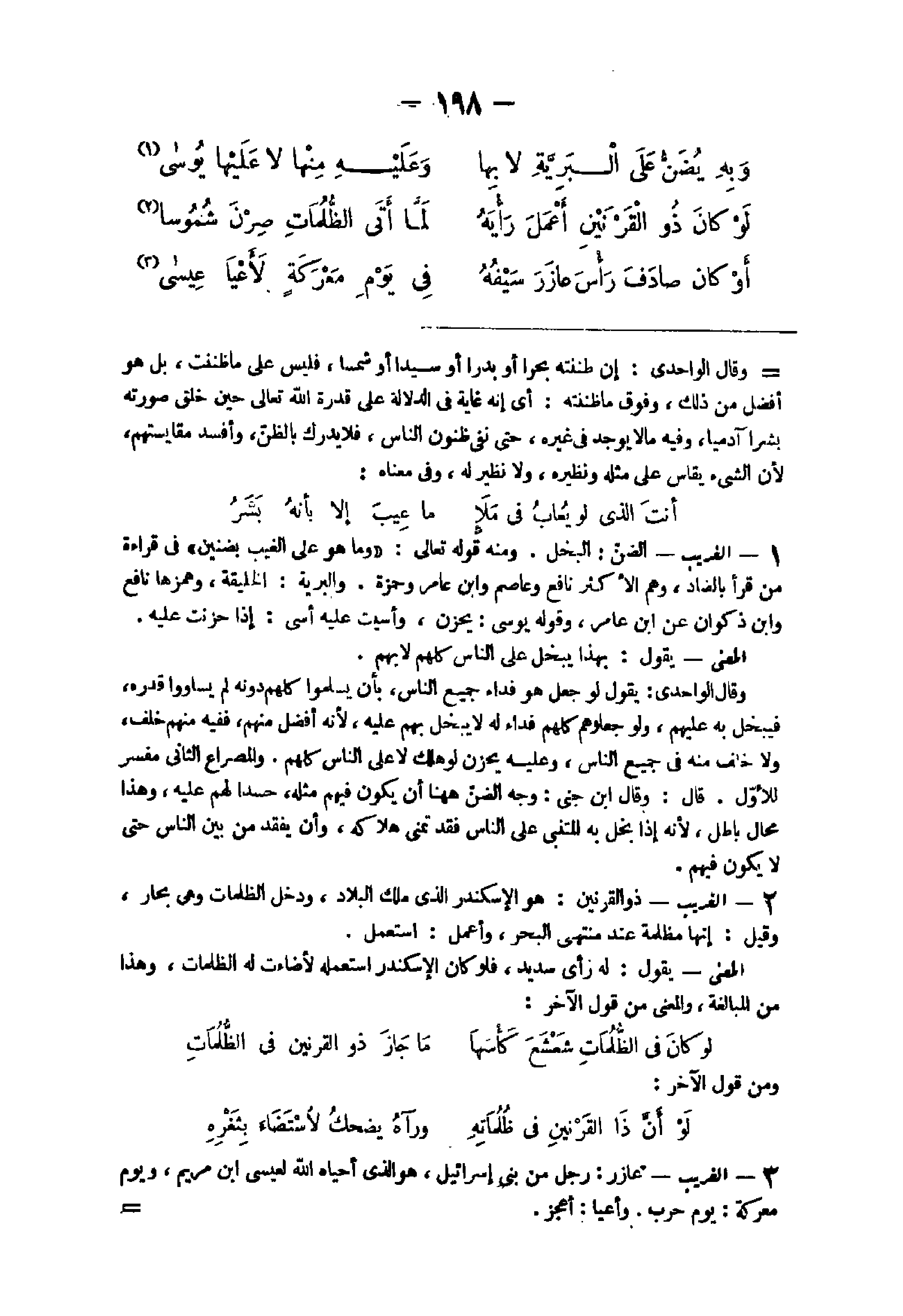 17 - الْغَرِيب ذُو القرنين هُوَ الْإِسْكَنْدَر الذى ملك الْبِلَاد وَدخل الظُّلُمَات وهى بحار وَقيل إِنَّهَا مظْلمَة عِنْد مُنْتَهى الببحر وأعمل اسْتعْمل الْمَعْنى يَقُول لَهُ رأى سديد فَلَو كَانَ الْإِسْكَنْدَر اسْتَعْملهُ لَأَضَاءَتْ لَهُ الظُّلُمَات وَهَذَا من الْمُبَالغَة وَالْمعْنَى من قَول الآخر
