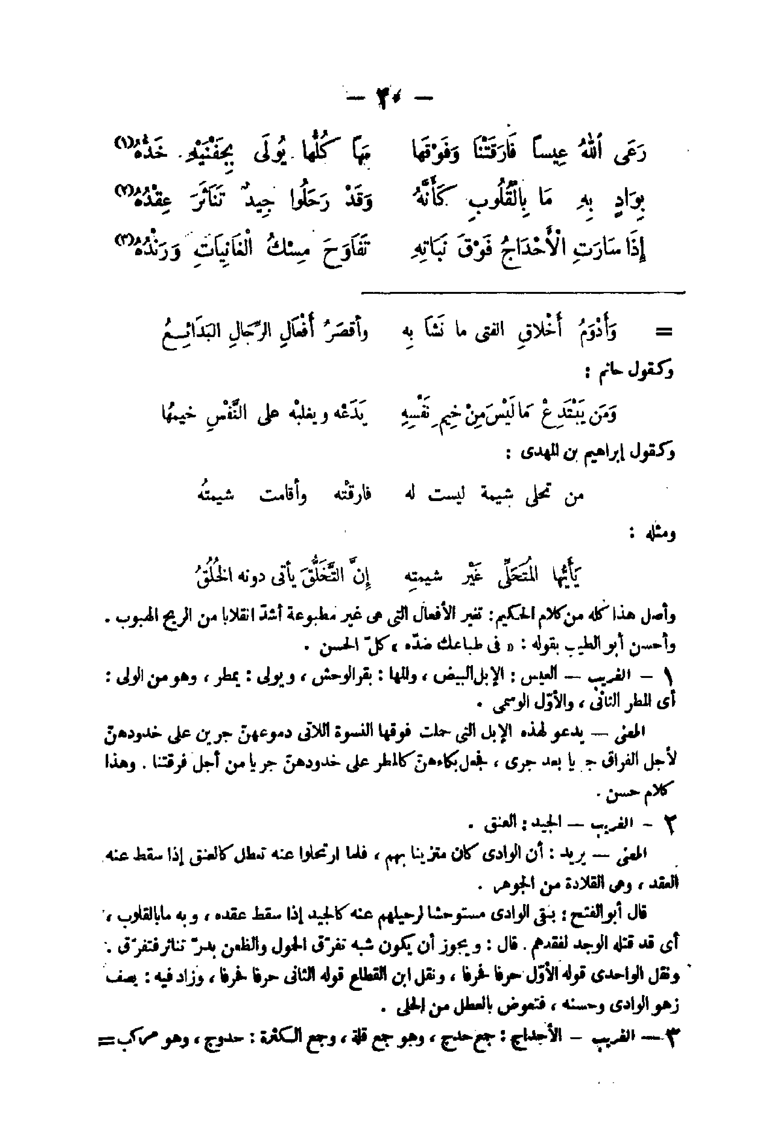6 - الْغَرِيب الْجيد الْعُنُق الْمَعْنى يُرِيد ان الوادى كَانَ متزينا بهم فَلَمَّا ارتحلوا عَنهُ تعطل كالعنق إِذا سقط عَنهُ العقد وهى القلادة من الْجَوْهَر قَالَ أَبُو الْفَتْح بقى الوادى مستوحشا لرحيلهم عَنهُ كالجيد إِذا سقط عقده وَبِه مَا بالقلوب أى قد قَتله الوجد لفقدهم قَالَ وَيجوز أَن يكون شبه تفرق الحمول والظعن يدر تناثر فَتفرق وَنقل الواحدى قَوْله الأول حرفا فحرفا وَنقل ابْن القطاع قَوْله الثانى حرفا فحرفا وَزَاد فِيهِ يصف زهو الوادى وَحسنه فتعوض بالعطل من الحلى