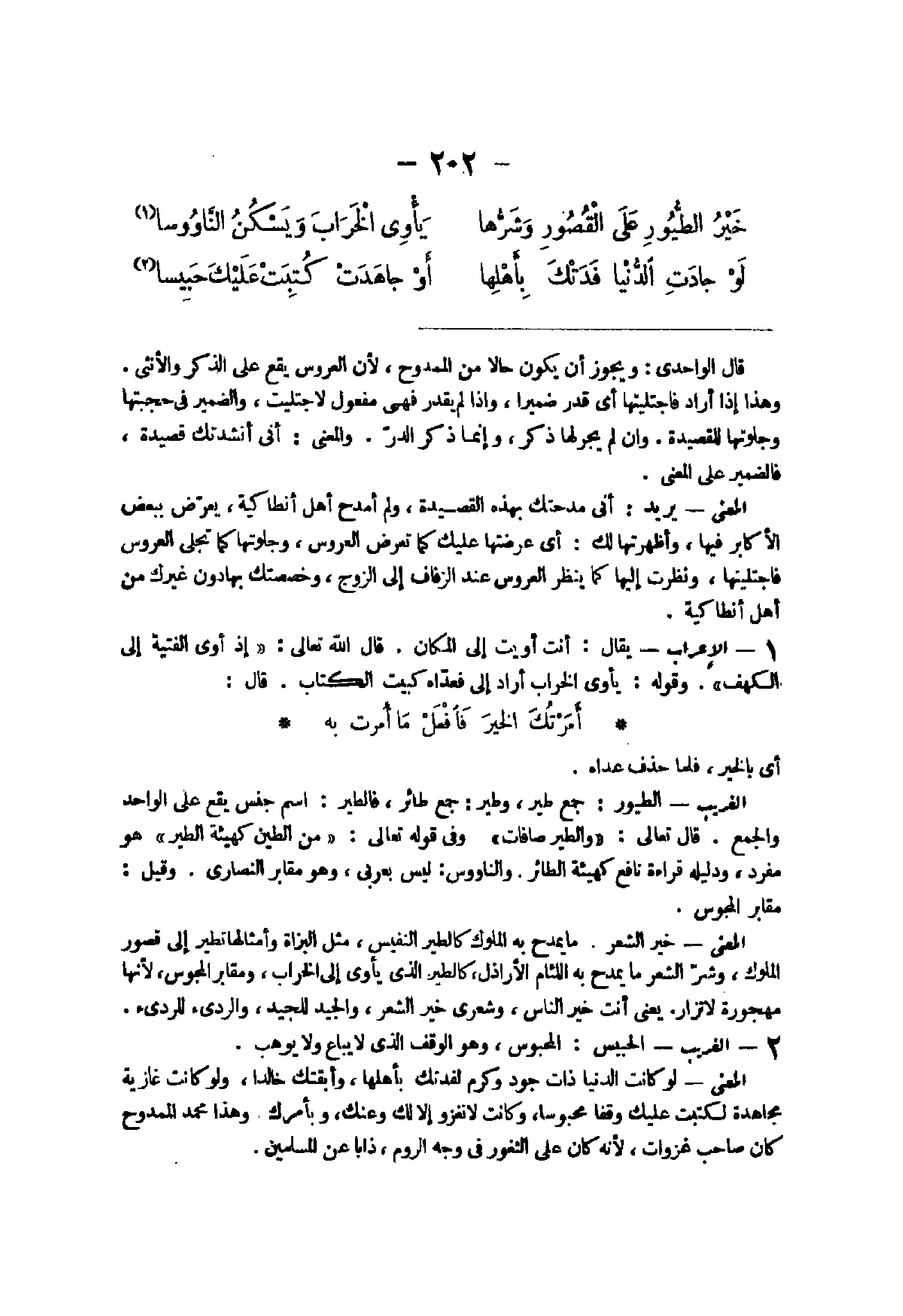 أى بِالْخَيرِ فَلَمَّا حذف عداهُ الْغَرِيب الطُّيُور جمع طير وطير جمع طَائِر فالطير اسْم جنس يَقع على الْوَاحِد وَالْجمع قَالَ الله تَعَالَى {وَالطير صافات} وفى قَوْله تَعَالَى {من الطين كَهَيئَةِ الطير} هُوَ مُفْرد وَدَلِيله قِرَاءَة نَافِع كَهَيئَةِ الطَّائِر والناووس لَيْسَ بعربى وَهُوَ مَقَابِر النَّصَارَى وَقيل مَقَابِر الْمَجُوس الْمَعْنى خير الشّعْر مَا يمدح بِهِ الْمُلُوك كالطير النفيس مثل البزاة وأمثالها تطير إِلَى قُصُور الْمُلُوك وَشر الشّعْر مَا يمدح بِهِ اللئام الأراذل كالطير الذى يأوى إِلَى الخراب ومقابر الْمَجُوس لِأَنَّهَا مهجورة لَا تزار يعْنى أَنْت خير النَّاس وشعرى خير الشّعْر والجيد للجيد والردئ للردئ