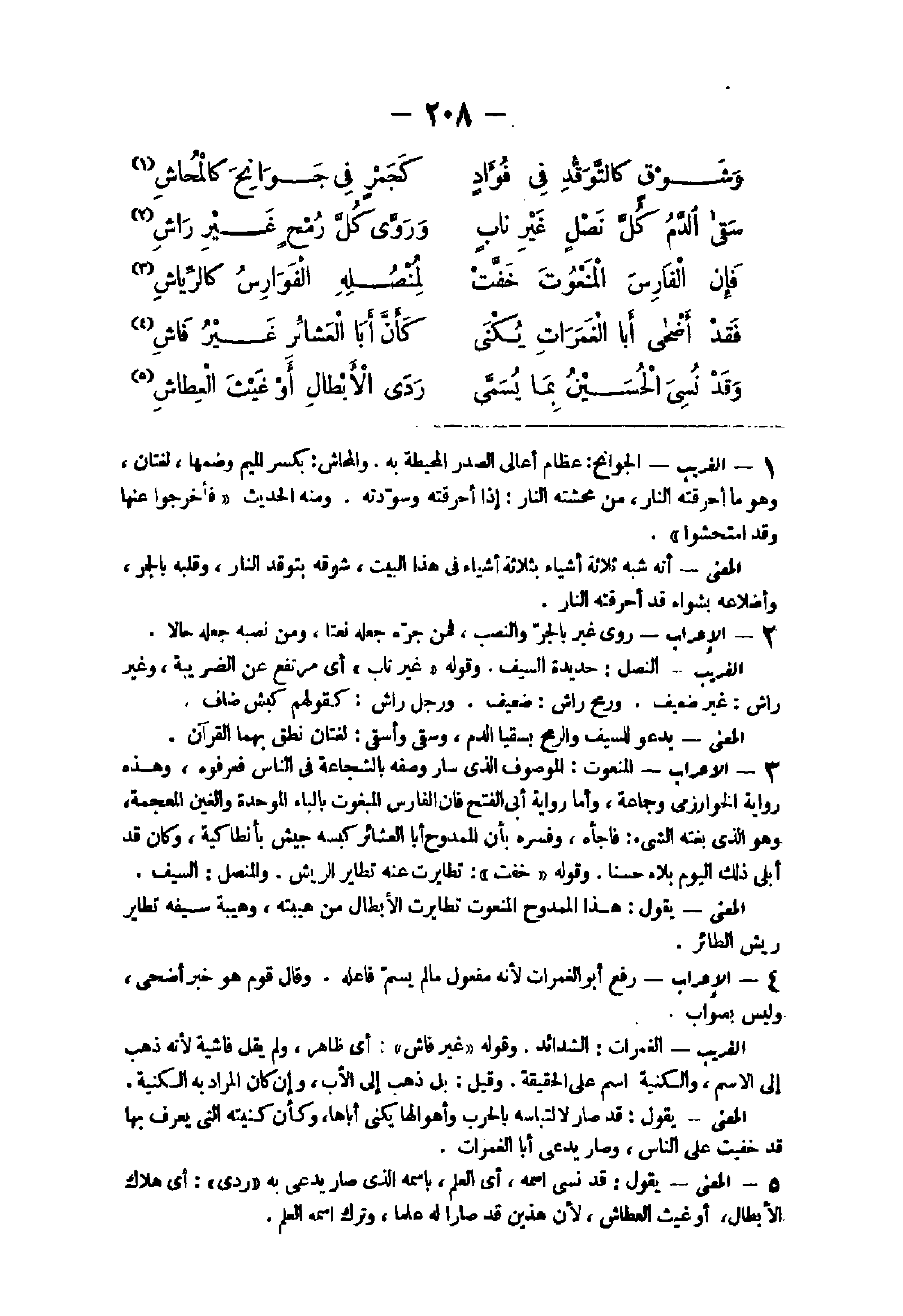 - الْغَرِيب الجوانح عِظَام أعالى الصَّدْر المحيطة بِهِ والمحاش بِكَسْر الْمِيم وَضمّهَا لُغَتَانِ وَهُوَ مَا أحرقته النَّار من محشته النَّار إِذا أحرقته وسودته وَمِنْه الحَدِيث " فأخرجوا عَنْهَا وَقد امتحشوا " الْمَعْنى أَنه شبه ثَلَاثَة أَشْيَاء بِثَلَاثَة أَشْيَاء فى هَذَا الْبَيْت شوقه بتوقد النَّار وَقَلبه بالجمر وأضلاعه بشواء قد أحرقته النَّار