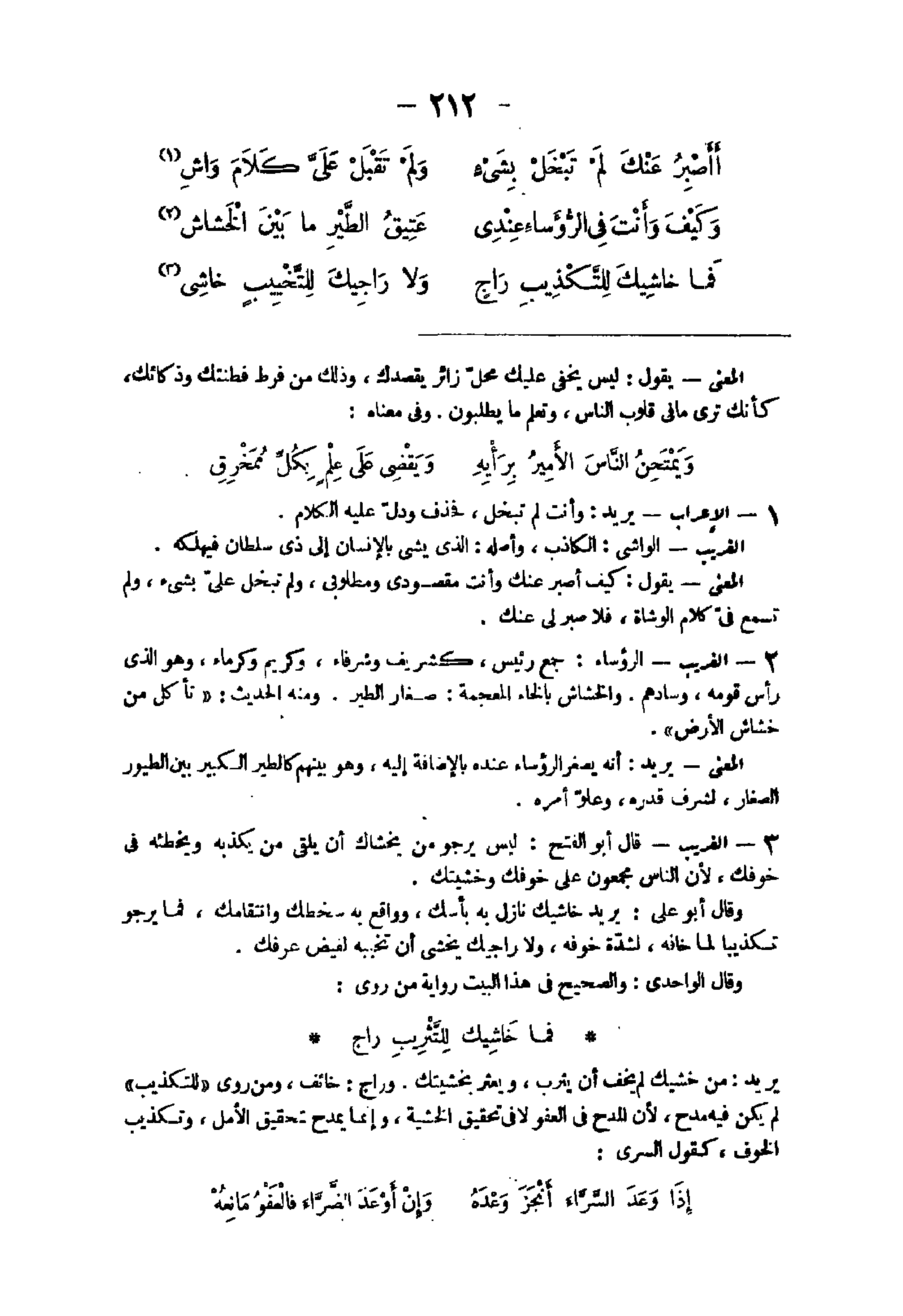 23 - الْغَرِيب قَالَ أَبُو الْفَتْح لَيْسَ يَرْجُو من يخشاك أَن يلقى من يكذبهُ ويخطئه فى خوفك لِأَن النَّاس مجمعون على خوفك وخشيتك وَقَالَ أَبُو على يُرِيد خاشيك نَازل بِهِ بأسك وواقع بِهِ سخطك وانتقامك فَمَا يَرْجُو تَكْذِيبًا لما خافه لشدَّة خَوفه وراجيك يخْشَى أَن تخيبه لفيض عرفك وَقَالَ الواحدى وَالصَّحِيح فى هَذَا الْبَيْت رِوَايَة من روى