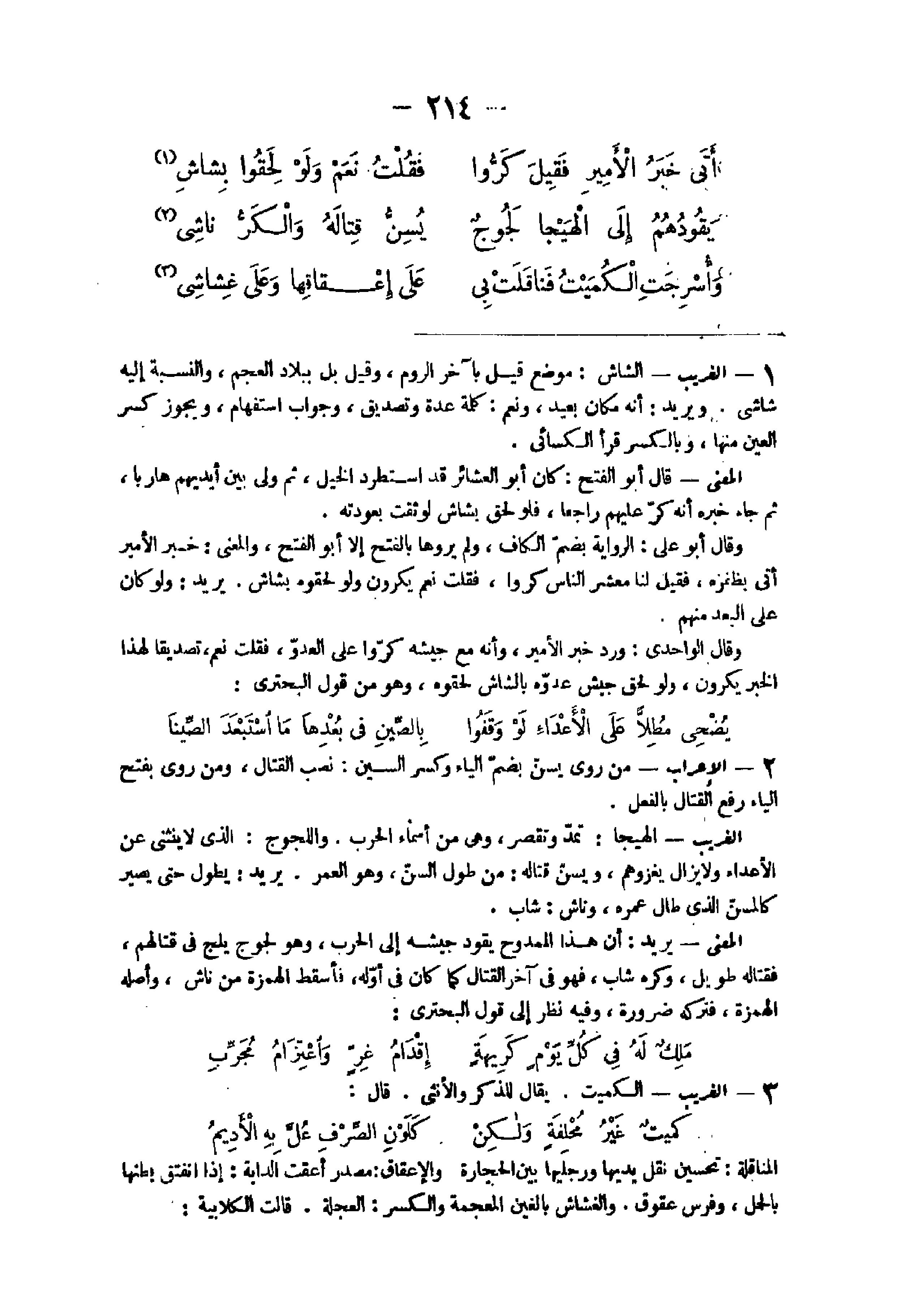 - الْغَرِيب الشاش مَوضِع قيل بآخر الرّوم وَقيل بل بِبِلَاد الْعظم وَالنِّسْبَة إِلَيْهِ شاشتى وَيُرِيد أَنه مَكَان بعيد وَنعم كلمة عدَّة وتصديق وَجَوَاب اسْتِفْهَام وَيجوز كسر الْعين مِنْهَا وبالكسر قَرَأَ الكسائى الْمَعْنى قَالَ أَبُو الْفَتْح كَانَ أَبُو العشائر قد استطرد الْخَيل ثمَّ ولى بَين أَيْديهم هَارِبا ثمَّ جَاءَ خَبره أَنه كرّ عَلَيْهِم رَاجعا فَلَو لحق بشاش لوثقت بعودته وَقَالَ أَبُو على الرِّوَايَة بِضَم الْكَاف وَلم يروها بِالْفَتْح إِلَّا أَبُو الْفَتْح وَالْمعْنَى خبر الْأَمِير أَتَى بظفره فَقيل لنا معشر النَّاس كروا فَقلت نعم يكرون وَلَو لحقوه بشاش يُرِيد وَلَو كَانَ على الْبعد مِنْهُم وَقَالَ الواحدى ورد خبر الْأَمِير وَأَنه مَعَ جَيْشه كروا على الْعَدو فَقلت نعم تَصْدِيقًا لهَذَا الْخَبَر يكرون وَلَو لحق جَيش عدوه بالشاش لحقوه وَهُوَ من قَول البحترى