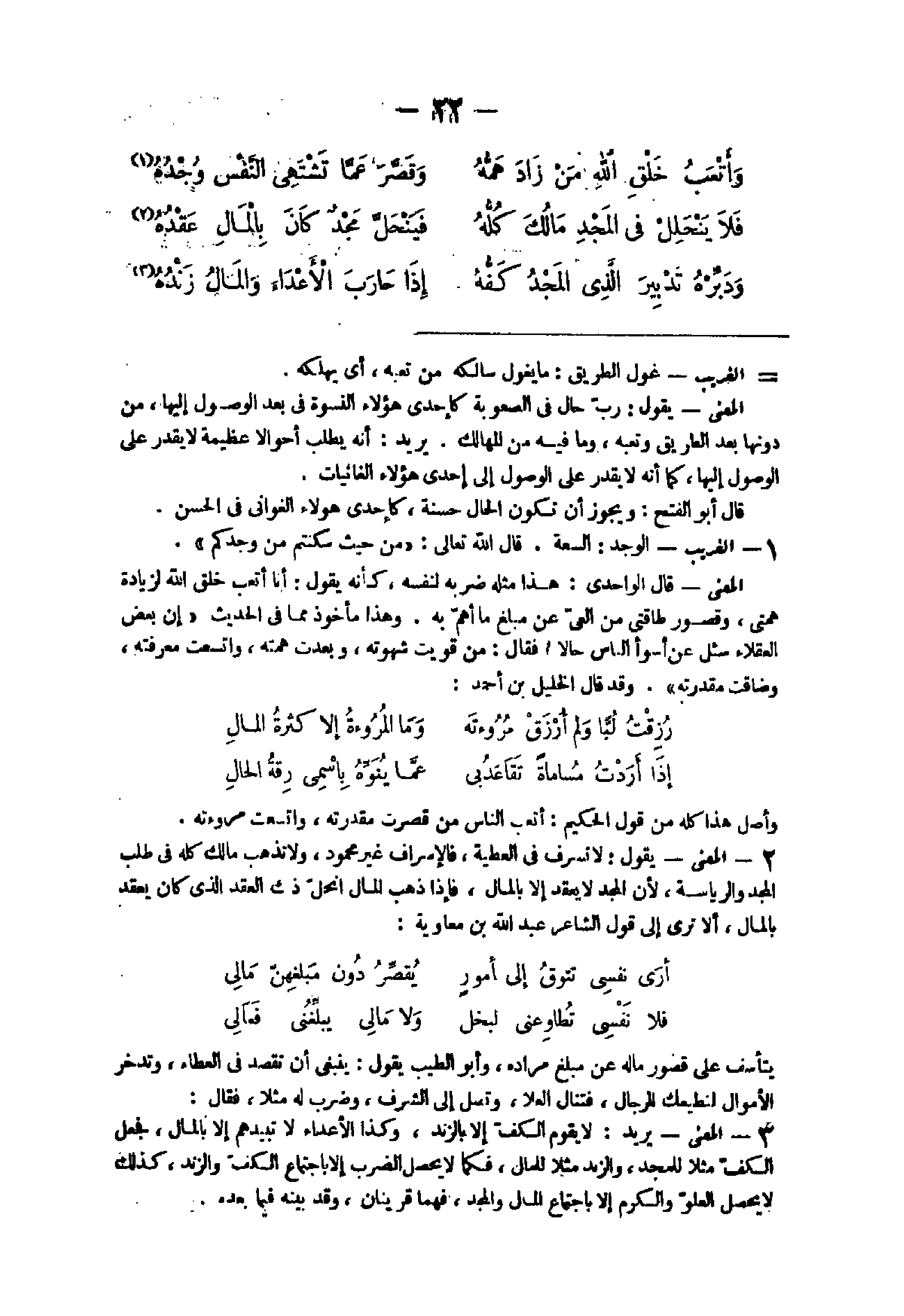 10 - الْمَعْنى يَقُول لَا تسرف فى الْعَطِيَّة فالإسراف غير مَحْمُود وَلَا تذْهب مَالك كُله فى طلب الْمجد والرياسة لِأَن الْمجد لَا يعْقد إِلَّا بِالْمَالِ فَإِذا ذهب المَال انحل ذَلِك العقد الذى كَانَ يعْقد بِالْمَالِ أَلا ترى إِلَى قَول الشَّاعِر عبد الله بن مُعَاوِيَة