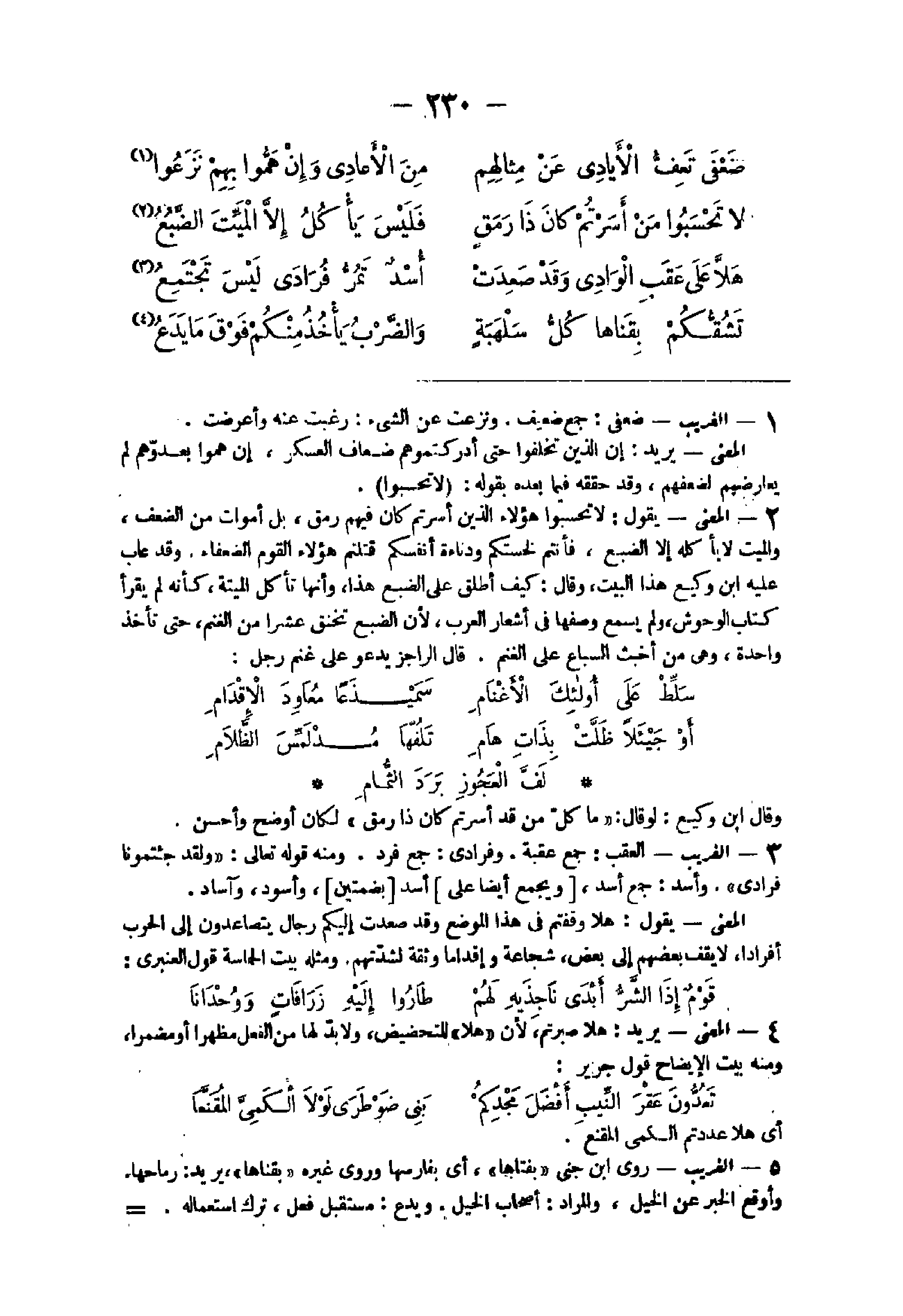 33 - الْمَعْنى يَقُول لَا تحسبوا هَؤُلَاءِ الَّذين أسرتم كَانَ فيهم رَمق بل أموات من الضعْف وَالْمَيِّت لَا يَأْكُلهُ إِلَّا الضبع فَأنْتم لخستكم ودناءة أَنفسكُم قتلتم هَؤُلَاءِ الْقَوْم الضُّعَفَاء وَقد عَابَ عَلَيْهِ ابْن وَكِيع هَذَا الْبَيْت وَقَالَ كَيفَ أطلق على الضبع هَذَا وَأَنَّهَا تَأْكُل الْميتَة كَأَنَّهُ لم يقْرَأ كتاب الوحوش وَلم يسمع وصفهَا فى أشعار الْعَرَب لِأَن الضبع تخنق عشرا من الْغم حَتَّى تَأْخُذ وَاحِدَة وَهِي من أَخبث السباغ على الْغنم قَالَ الزاجر يَدْعُو على غنم رجل