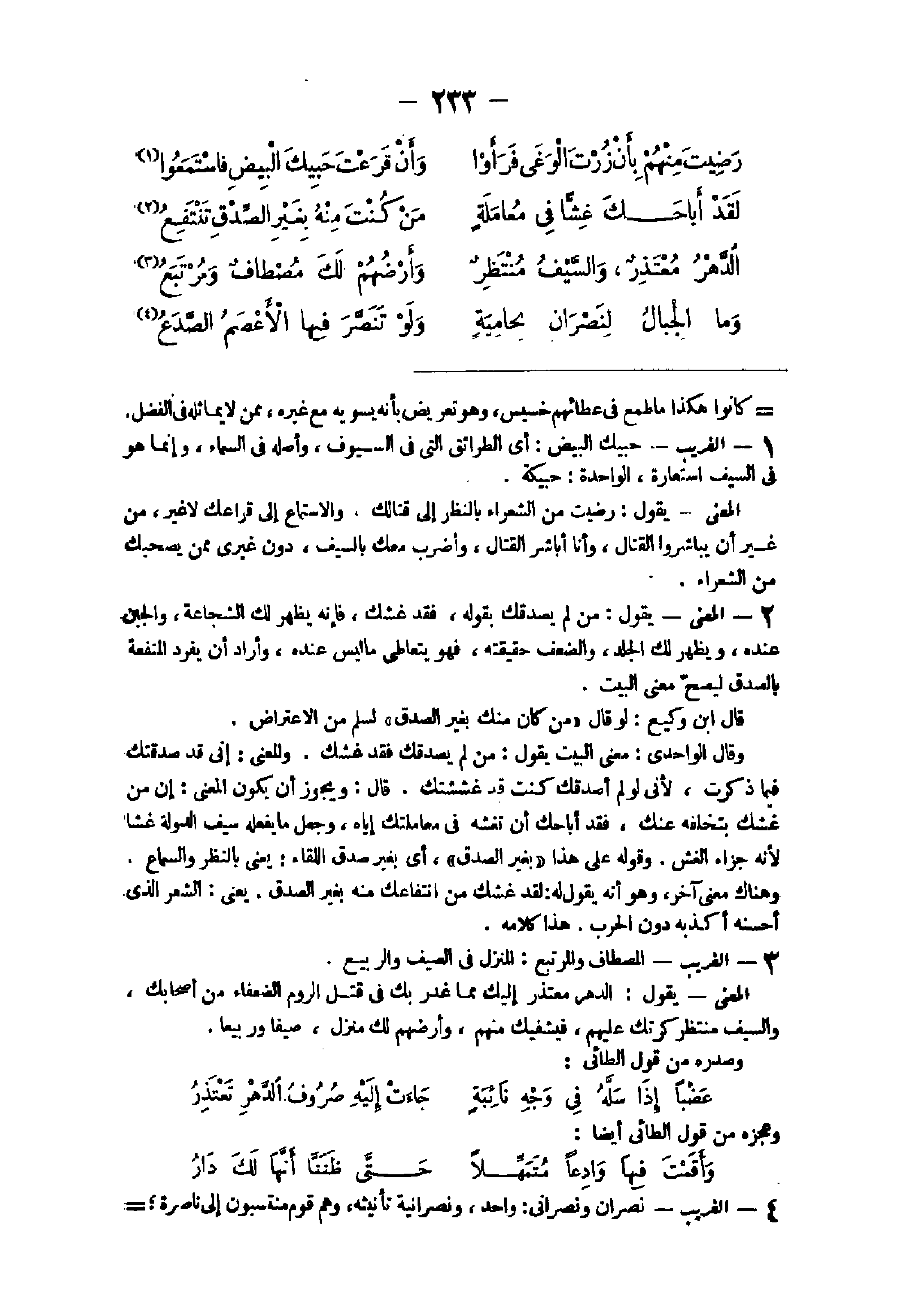 - الْغَرِيب حبيك الْبيض أى الطرائق الَّتِى فى السيوف وَأَصله فى السَّمَاء وَإِنَّمَا هُوَ فى السَّيْف اسْتِعَارَة الْوَاحِدَة حبيكة الْمَعْنى يَقُول رضيت من الشُّعَرَاء بِالنّظرِ إِلَى قتالك وَالِاسْتِمَاع إِلَى قراعك لَا غير من غير أَن يباشروا الْقِتَال وَأَنا أباشر الْقِتَال وأضرب مَعَك بِالسَّيْفِ دون غيرى مِمَّن يصحبك من الشُّعَرَاء