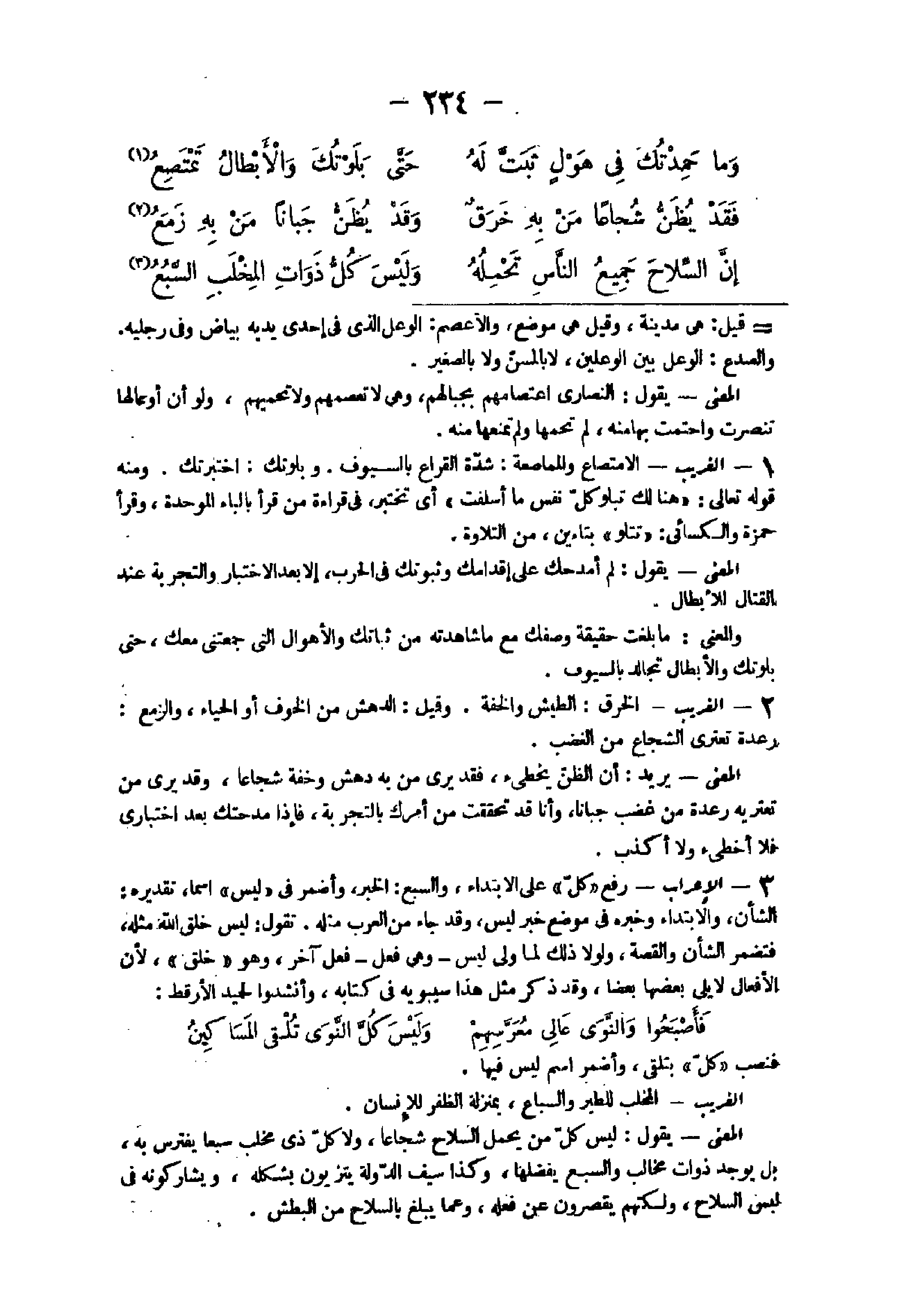 - الْغَرِيب الامتصاع والمماصعة شدَّة القراع بِالسُّيُوفِ وبلوتك اخبترتك وَمِنْه قَوْله تَعَالَى {هُنَالك تبلو كل نفس مَا أسلفت} أى تختبر فى قِرَاءَة من قَرَأَ بِالْبَاء الْمُوَحدَة وَقَرَأَ حَمْزَة والكسائى تتلو بتاءين من التِّلَاوَة الْمَعْنى يَقُول لم أمدحك على إقدامك وثبوتك فى الْحَرْب إِلَّا بعد الاختبار والتجربة عِنْد الْقِتَال للأبطال وَالْمعْنَى مَا بلغت حَقِيقَة وصفك مَعَ مَا شاهدته من ثباتك والأهوال الَّتِى جمعتنى مَعَك حَتَّى بلوتك والأبطال تجالد بِالسُّيُوفِ