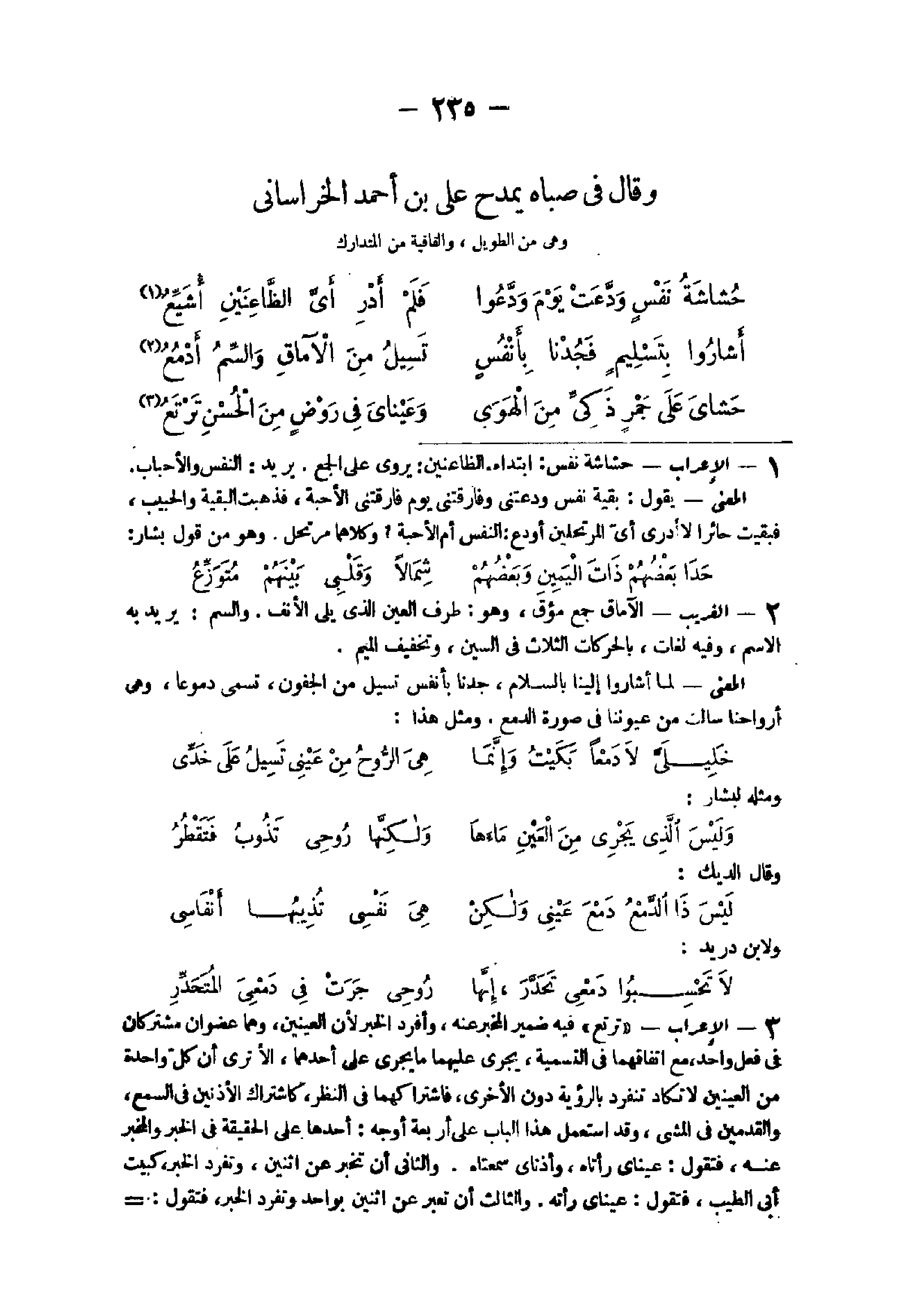 - 1 - الْإِعْرَاب حشاشة نفس ابْتِدَاء الظاعنين يرْوى على الْجمع يُرِيد النَّفس والأحباب الْمَعْنى يَقُول بَقِيَّة نفس ودعتنى وفارقتنى يَوْم فارفتنى الْأَحِبَّة فَذَهَبت الْبَقِيَّة والحبيب فَبَقيت حائرا لَا أدرى أى المرتحلين أودع النَّفس أم الْأَحِبَّة وَكِلَاهُمَا مرتحل وَهُوَ من قَول بشار