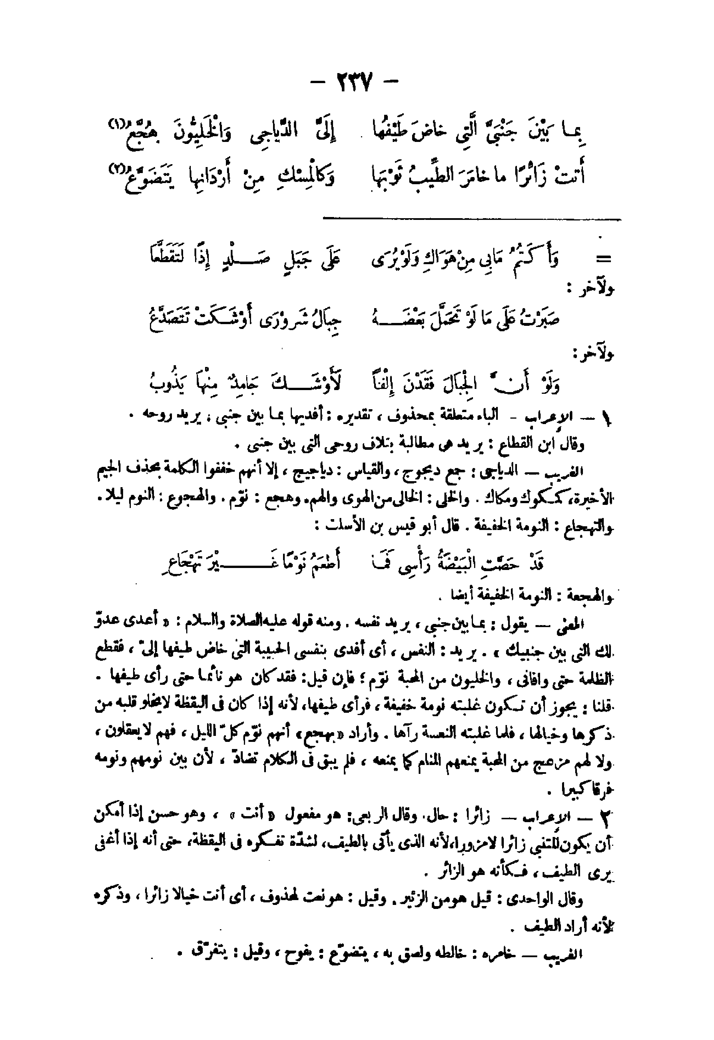 - الْإِعْرَاب الْبَاء مُتَعَلقَة بِمَحْذُوف تَقْدِيره أفديها بِمَا بَين جنبى يُرِيد روحه وَقَالَ ابْن القطاع يُرِيد هى مُطَالبَة بتلاف روحى الَّتِى بَين جنبى الْغَرِيب الدياجى جمع ديجوج وَالْقِيَاس دياجيج إِلَّا أَنهم خففوا الْكَلِمَة بِحَذْف الْجِيم الْأَخِيرَة كمكوك ومكاك والخلى الخالى من الْهوى والهم وهجع نوم والهجوع النّوم لَيْلًا والتهجاع النومة الْخَفِيفَة قَالَ أَبُو قيس بن الأسلت