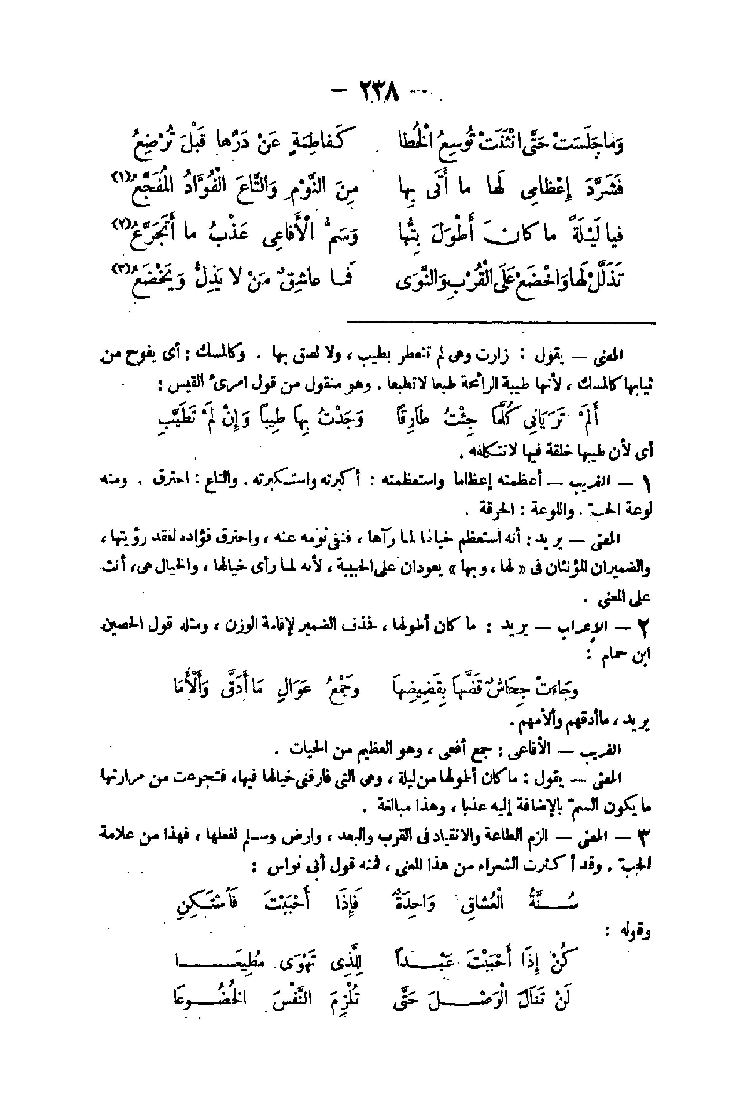 - الْغَرِيب أعظمته إعظاما واستعظمته أكبرته واستكبرته والتاع احْتَرَقَ وَمِنْه لوعة الْحبّ واللوعة الحرقة الْمَعْنى يُرِيد أَنه استعظم خيالها لما رَآهَا فنفى نَومه عَنهُ وَاحْتَرَقَ فُؤَاده لفقد رؤيتها والضميران المؤنثان فى لَهَا وَبهَا يعودان على الحبيبة لِأَنَّهُ لما رأى خيالها والخيال هِيَ أنث على الْمَعْنى 9 - الْأَعْرَاب يُرِيد ماكان أطولها فَحذف لإِقَامَة الْوَزْن وَمثله قَول الْحصين ابْن حمام