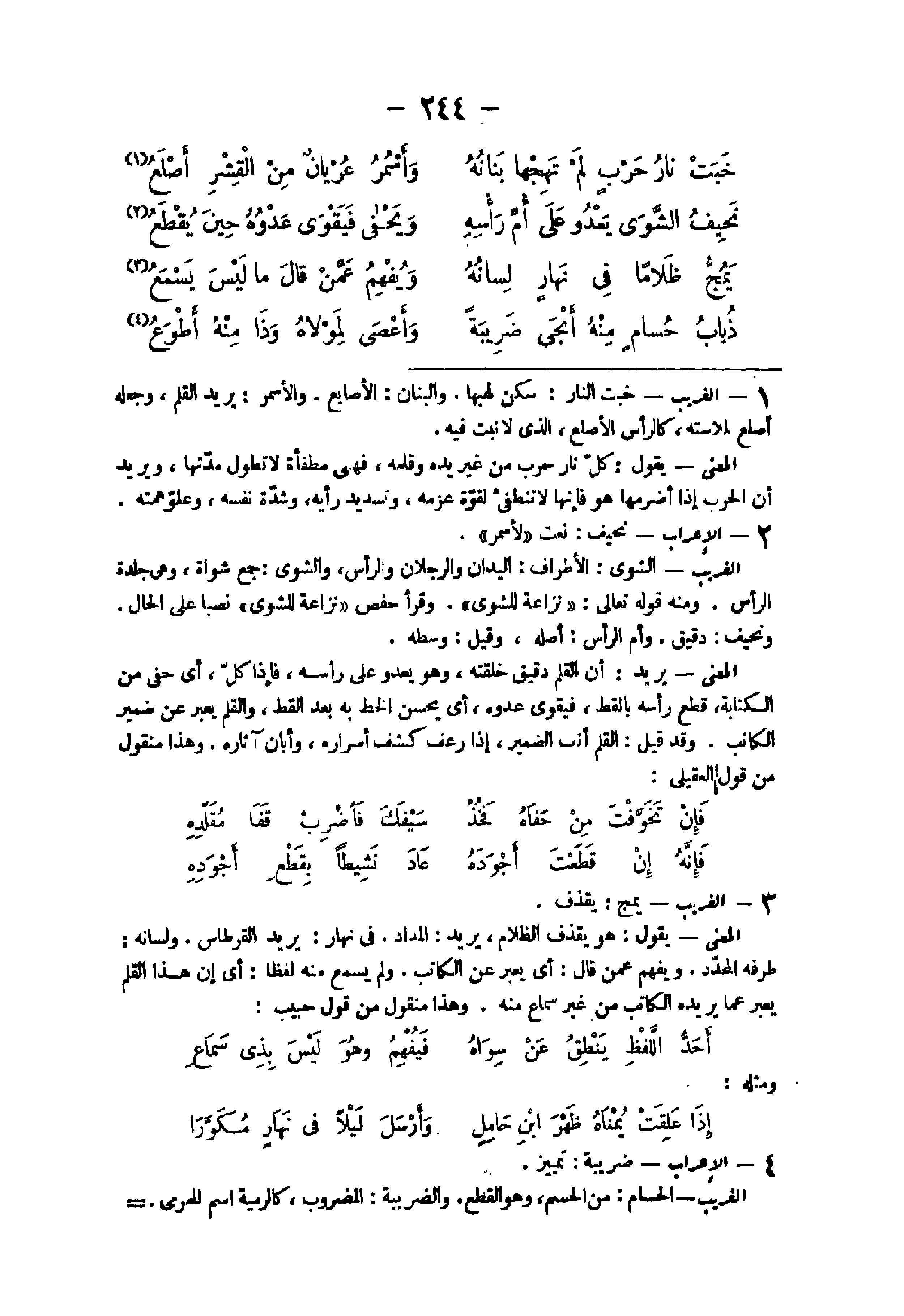 19 - الْإِعْرَاب نحيف نعت الأسمر الْغَرِيب الشوى الْأَطْرَاف اليدان وَالرجلَانِ وَالرَّأْس والشوى جمع شواه وهى جلدَة الرَّأْس وَمِنْه قَوْله تَعَالَى {نزاعة للشوى} وَقَرَأَ حَفْص {نزاعة للشوى} نصبا على الْحَال وَكَيف دَقِيق وَأم الرَّأْس أَصله وَقيل وَسطه الْمَعْنى يُرِيد أَن الْقَلَم دَقِيق خلقته وَهُوَ يعدو على رَأسه فَإِذا كل أى حفى من الْكِتَابَة قطع راسه بالقط فيقوى عدوه أى يحسن الْخط بِهِ بعد القط والقلم يعبر عَن ضمير الْكَاتِب وَقد قيل الْقَلَم أنف الضَّمِير إِذا رعف كشف أسراره وَأَبَان آثاره وَهَذَا مَنْقُول من قَول العقيلى