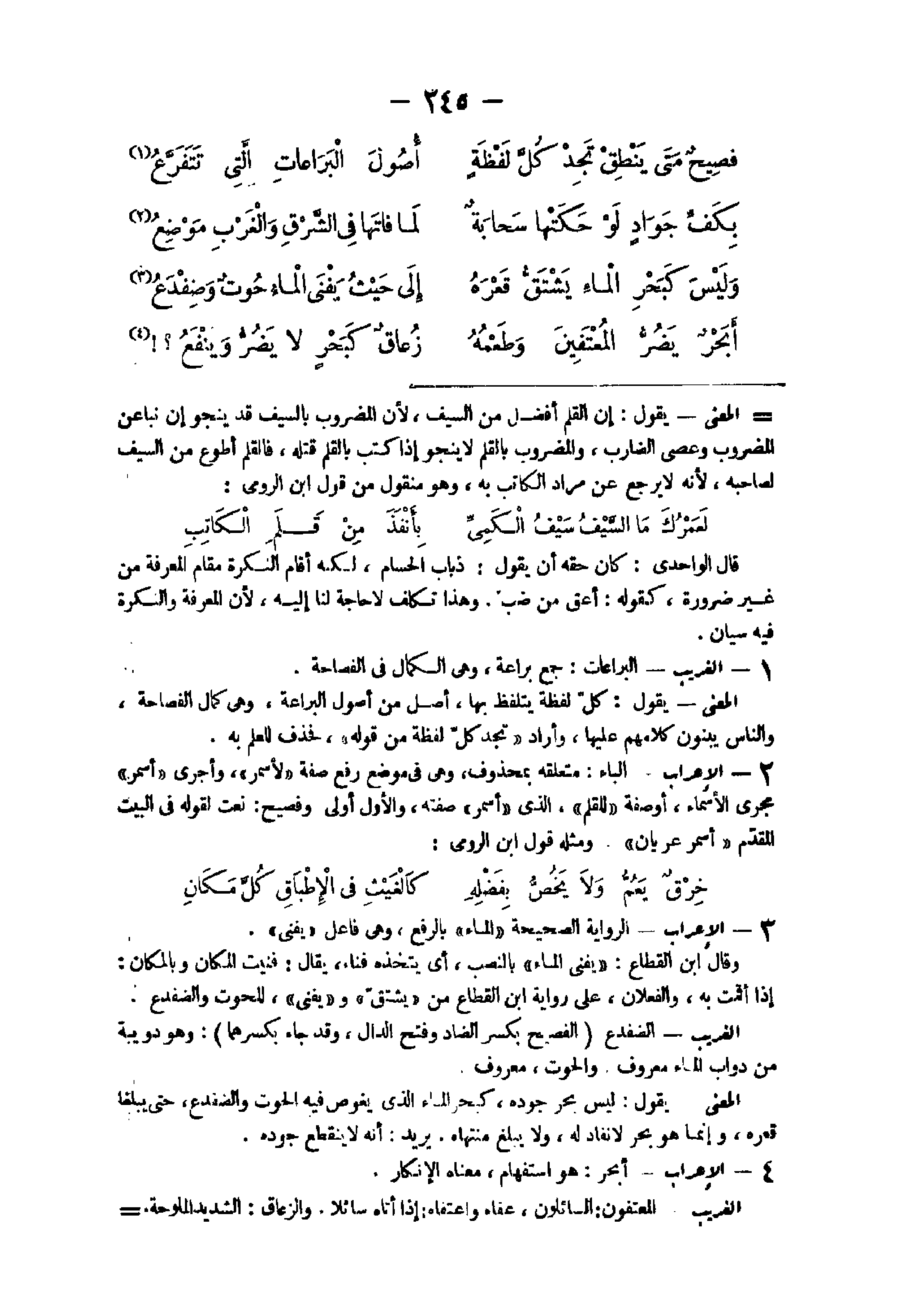 25 - الْإِعْرَاب أبحر هُوَ اسْتِفْهَام مَعْنَاهُ الْإِنْكَار الْغَرِيب المعتفون السائلون عفاه واعتفاه إِذا أَتَاهُ سَائِلًا والزعاق الشَّديد الملوحة الْمَعْنى قَالَ الواحدى يُرِيد أَن يفضل الممدوح على الْبَحْر يَقُول لَيْسَ بَحر يضر من ورده بِالْغَرَقِ وَهُوَ مر الطّعْم لَا يُمكن شربه كبحر ينفع الواردين بالعطاء وَلَا يضرهم وَلَو قَالَ ينفع وَلَا يضر لَكَانَ حسنا حَتَّى لَا يتَوَهَّم نفى الضّر والنفع جَمِيعًا لكنه قدم لَا يضر لإِثْبَات القافية قَالَ ابْن جنى وَهَذَا فِيهِ قبح لِأَن الْمَشْهُور عِنْدهم أَن ينْسب الممدوح إِلَى الْمَنْفَعَة للأولياء والضر للأعداء كَقَوْل الشَّاعِر