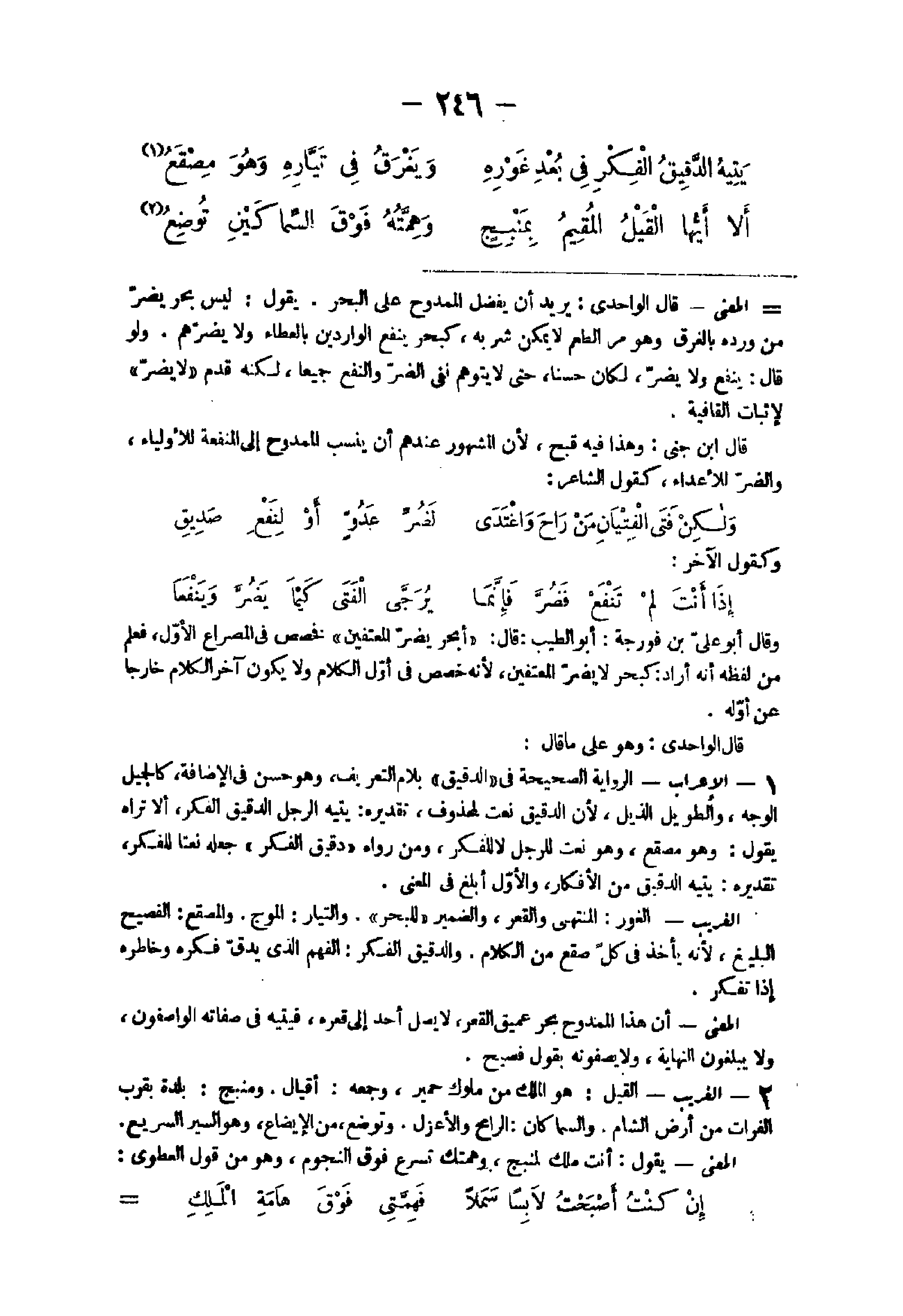 - الْإِعْرَاب الرِّوَايَة الصَّحِيحَة فى الدَّقِيق بلام التَّعْرِيف وَهُوَ // حسن // فى الْإِضَافَة كالجميل الْوَجْه والطويل الذيل لِأَن الدَّقِيق نعت لمَحْذُوف تَقْدِيره يتيه الرجل الدَّقِيق الْفِكر أَلا ترَاهُ يَقُول وَهُوَ مصقع وَهُوَ نعت للرجل لَا للفكر وَمن رَوَاهُ دَقِيق الْفِكر جعله نعتا للفكر تَقْدِيره يتيه الدَّقِيق من الأفكار وَالْأول أبلغ فى الْمَعْنى الْغَرِيب الْغَوْر الْمُنْتَهى والقعر وَالضَّمِير للبحر والتيار الموج والمصقع الفصيح البليغ لِأَنَّهُ يَأْخُذ فى كل صقع من الْكَلَام والدقيق الْفِكر الْفَهم الذى يدق فكره وخاطره إِذا تفكر الْمَعْنى أَن هَذَا الممدوح بَحر عميق القعر لَا يصل أحد إِلَى قَعْره فيتيه فى صِفَاته الواصفون وَلَا يبلغون النِّهَايَة وَلَا يصفونه بقول فصيح