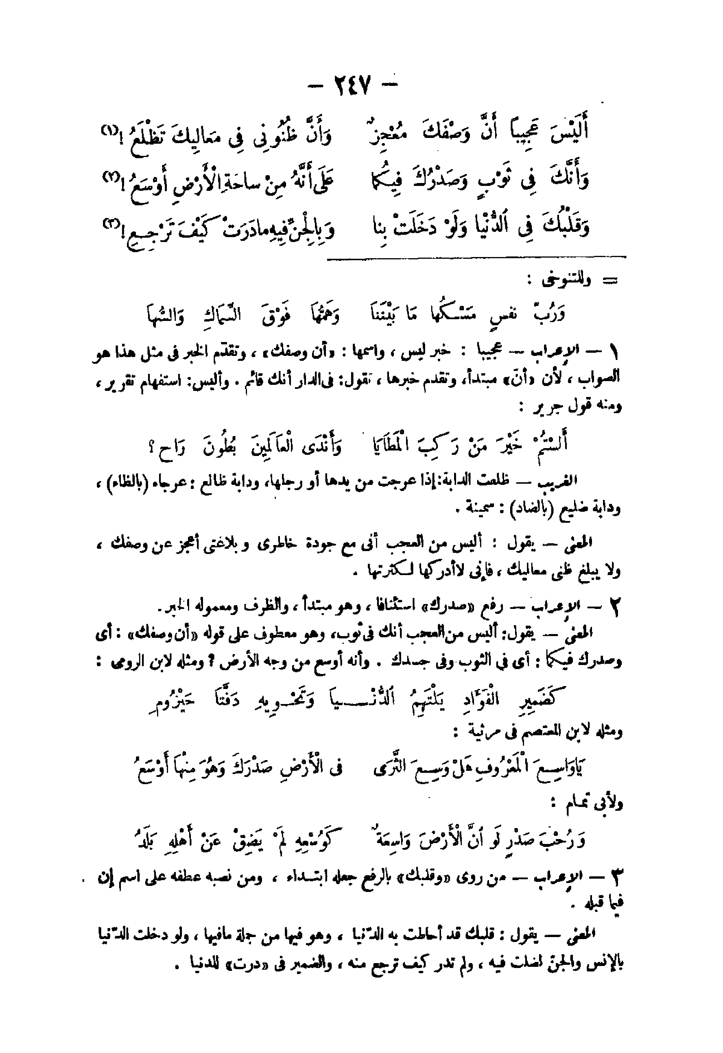 - الْإِعْرَاب عجيبا خبر لَيْسَ وَاسْمهَا أَن وصفك وَتقدم الْخَبَر فى مثل هَذَا هُوَ الصَّوَاب لِأَن أَن مُبْتَدأ وَتقدم خَبَرهَا تَقول تَقول فى الدَّار أَنَّك قَائِم وأليس اسْتِفْهَام تَقْرِير وَمِنْه قَول جرير