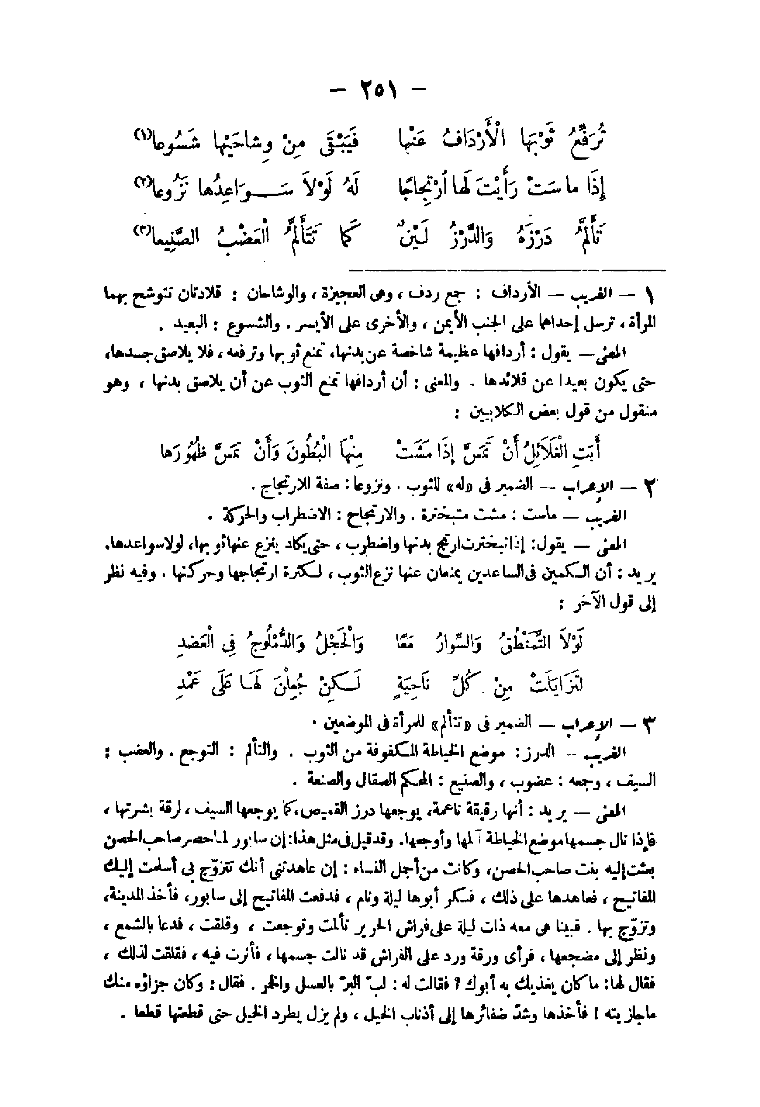 - الْغَرِيب الأرداف جمع ردف وهى العجيزة والوحاشان قلادتان تتوشح بهما الْمَرْأَة ترسل إِحْدَاهمَا على الْجنب الْأَيْمن وَالْأُخْرَى على الْأَيْسَر والشسوع الْبعيد الْمَعْنى يَقُول أردافها عَظِيمَة شاخصة عَن بدنهَا تمنع ثوبها وترفعه فَلَا يلاصق جَسدهَا حَتَّى يكون بَعيدا عَن قلائدها وَالْمعْنَى أَن أردافها تمنع الثَّوْب عَن أَن يلاصق بدنهَا وَهُوَ مَنْقُول من قَول بعض الكلابيين