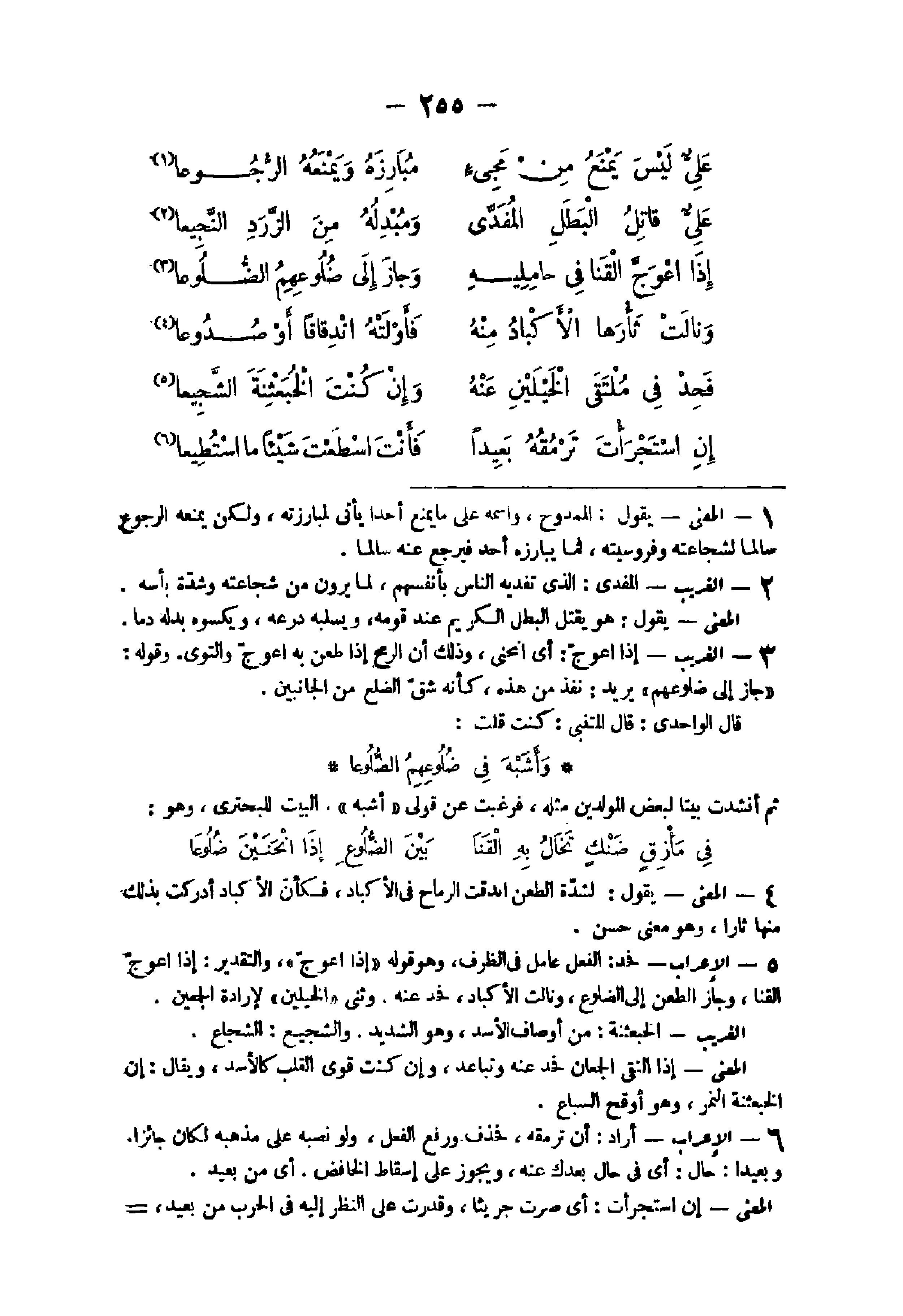 وَالتَّقْدِير إِذا اعوج القنا وَجَاز الطعْن إِلَى الضلوع ونالت الأكباد فحد عَنهُ وثنى الخيلين لإِرَادَة الجمعين الْغَرِيب الخبعثنة من أَوْصَاف الْأسد وَهُوَ الشَّديد والشجيع الشجاع الْمَعْنى إِذا التقى الْجَمْعَانِ فحد عَنهُ وتباعد وَإِن كنت قوى الْقلب كالأسد وَيُقَال إِن الخبعثنة النمر وَهُوَ أوقح السبَاع