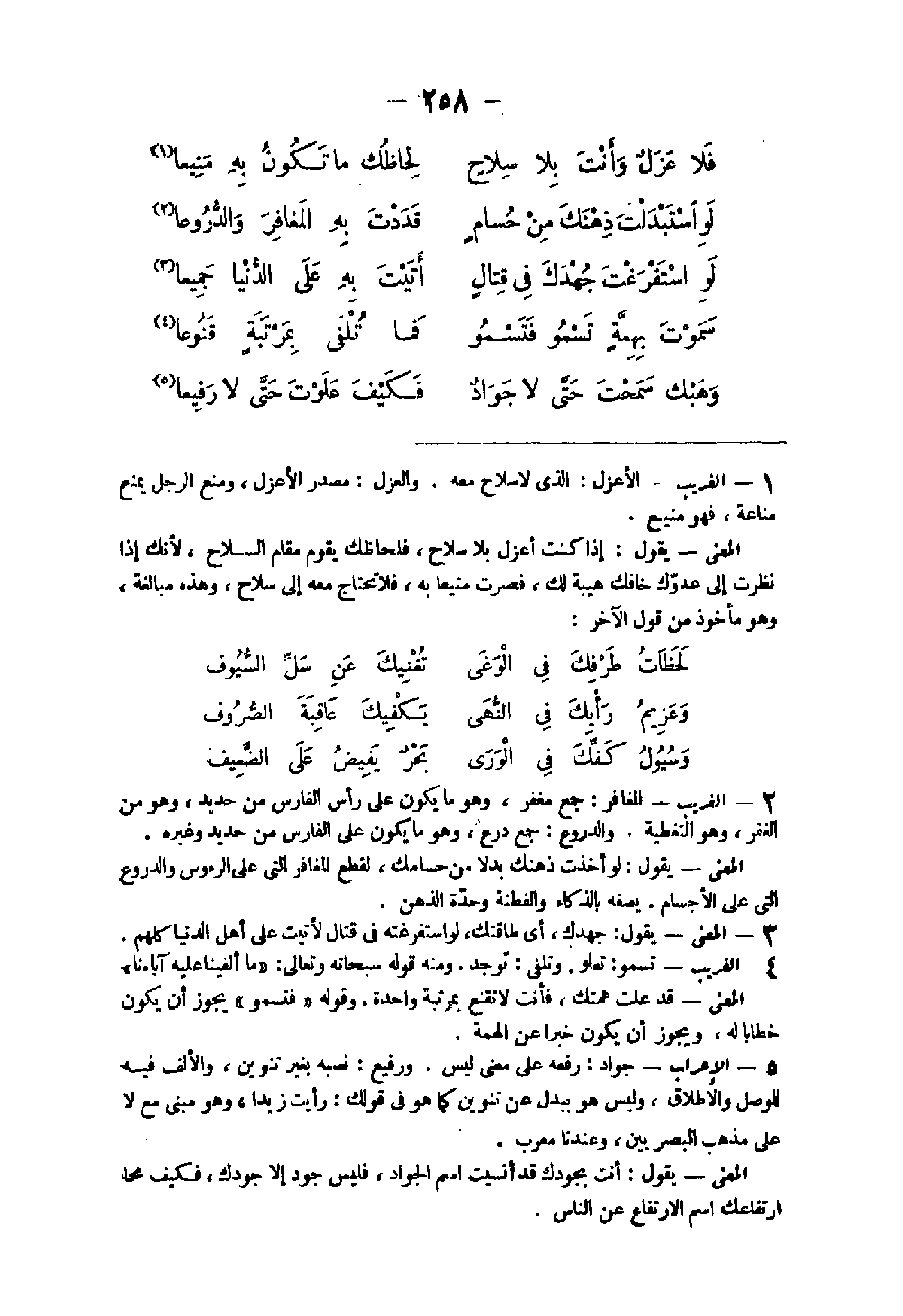 - الْغَرِيب الأعزل الذى لَا سلَاح مَعَه والعزل مصدر الأعزل وَمنع الرجل يمْنَع مناعة فَهُوَ منيع الْمَعْنى يَقُول إِذا كنت أعزل بِلَا سلَاح فلحاظك يقوم مقَام السِّلَاح لِأَنَّك إِذا نظرت إِلَى عَدوك خافك هَيْبَة لَك فصرت منيعا بِهِ فَلَا تحْتَاج مَعَه إِلَى سلَاح // وَهَذِه مُبَالغَة // وَهُوَ مَأْخُوذ من قَول الآخر