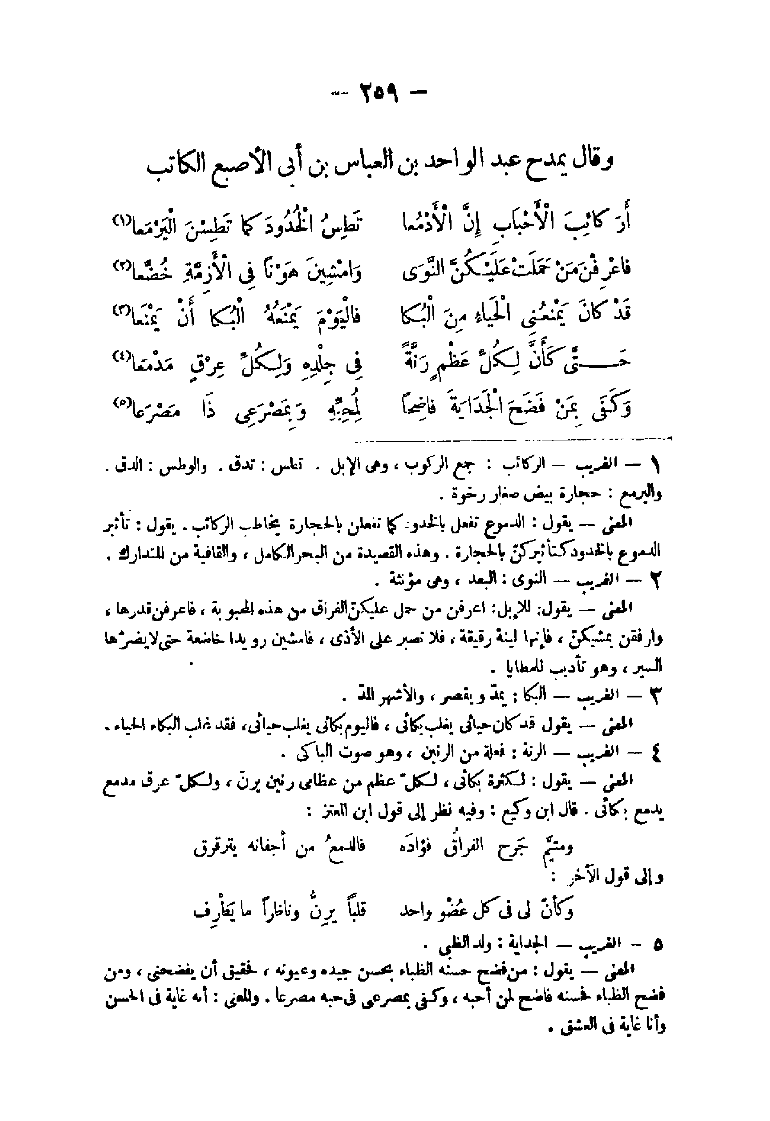 - 1 - الْغَرِيب الركائب جمع الرّكُوب وهى الْإِبِل تطس تدق والوطس الدق واليرمع حِجَارَة بيض صغَار رخوة الْمَعْنى يَقُول الدُّمُوع تفعل بالخدود كَمَا يفعلن بِالْحِجَارَةِ يُخَاطب الركائب يَقُول تَأْثِير الدُّمُوع بالخدود كتأثير كن بِالْحِجَارَةِ وَهَذِه القصيدة من الْبَحْر الْكَامِل والقافية من المتدارك