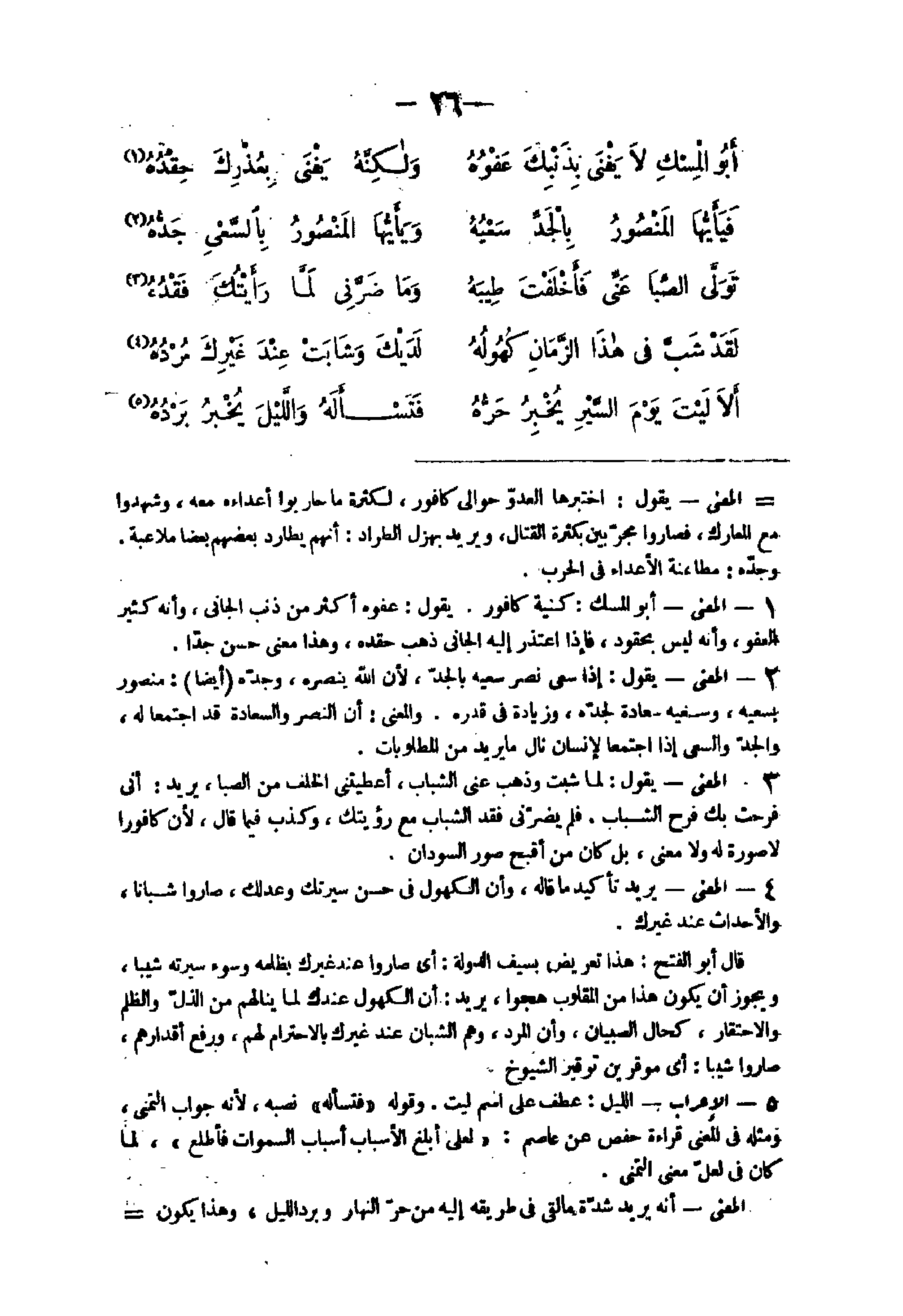 28 - الْمَعْنى يَقُول لما شبت وَذهب عَنى الشَّبَاب أعطيتنى الْخلف من الصِّبَا يُرِيد أَنى فرحت بك فَرح الشَّبَاب فَلم يضرنى فقد الشَّبَاب مَعَ رؤيتك وَكذب فِيمَا قَالَ لِأَن كافورا لَا صُورَة لَهُ وَلَا معنى بل كَانَ من أقبح صور السودَان