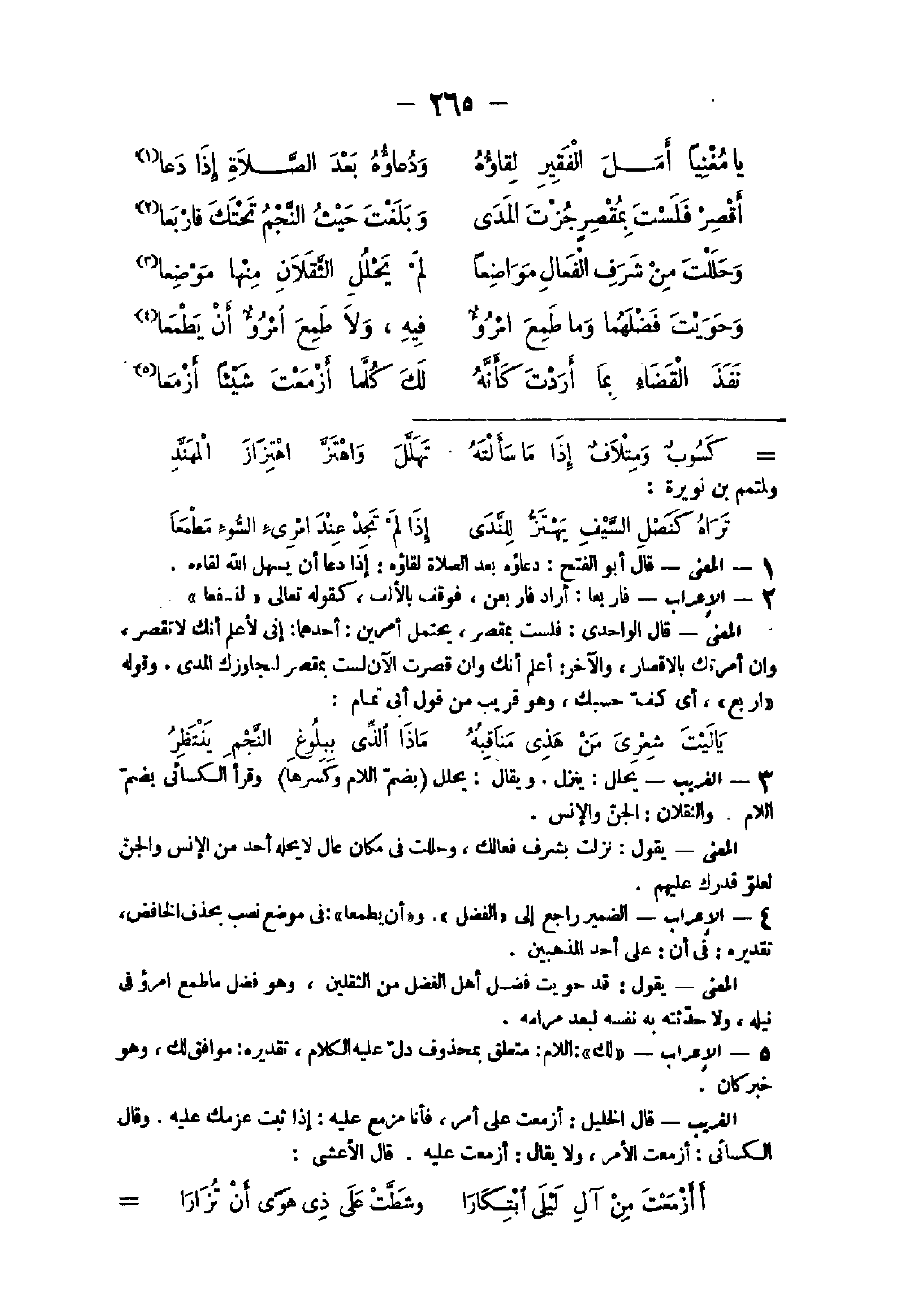 25 - الْإِعْرَاب فاربعا أَرَادَ فاربعن فَوقف بِالْألف كَقَوْلِه تَعَالَى {لنسفعا} الْمَعْنى قَالَ الواحدى فلست بمقصر يحْتَمل أَمريْن أَحدهمَا إنى لأعْلم أَنَّك لَا تقصر وَإِن أَمرتك بالإقصار وَالْآخر أعلم أَنَّك وَإِن قصرت الْآن لست بمقصر لتجاوزك المدى وَقَوله ارْبَعْ أى كف حَسبك وَهُوَ قريب من قَول أَبى تَمام