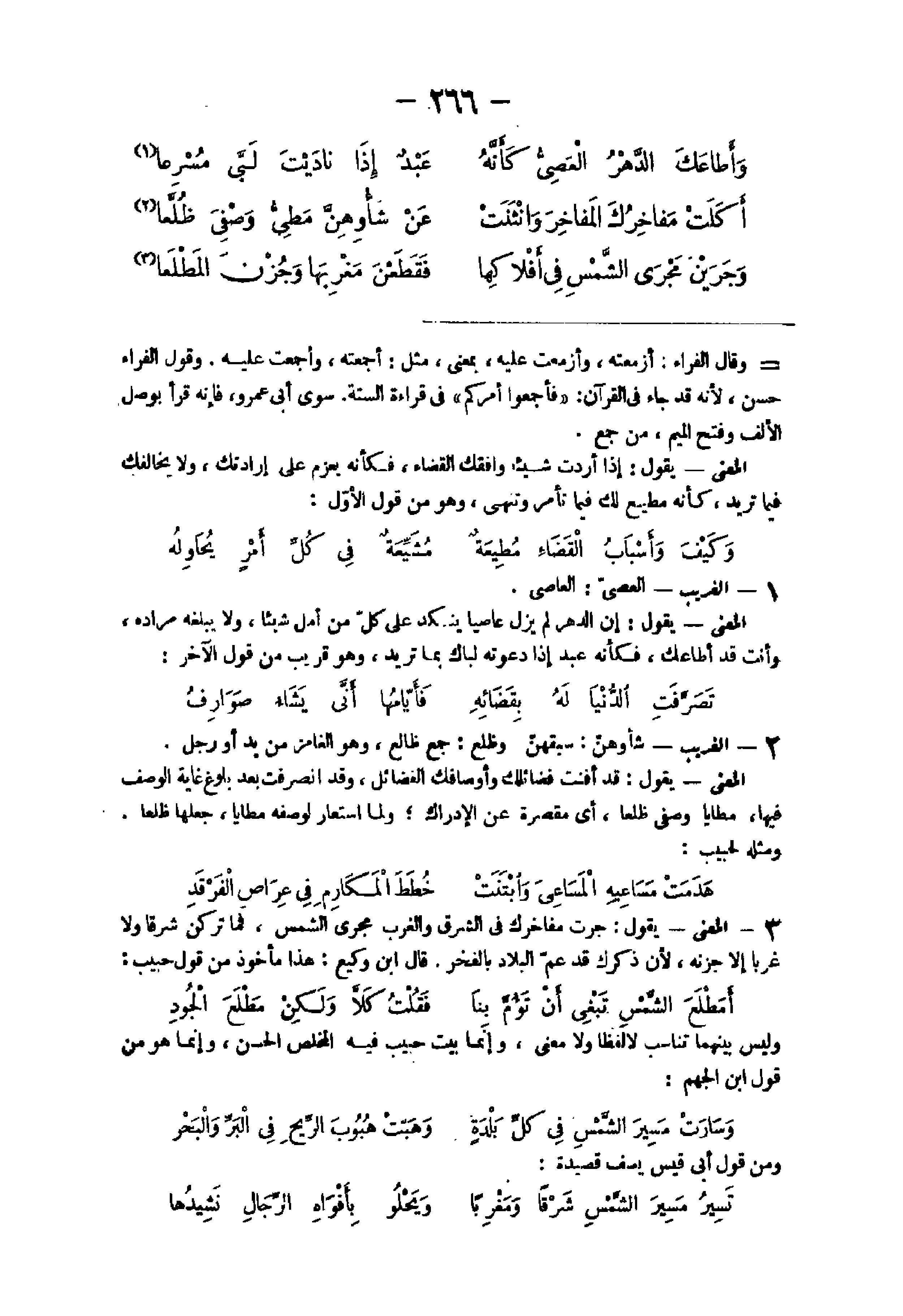 - الْغَرِيب العصى العاصى الْمَعْنى يَقُول إِن الدَّهْر لم يزل عَاصِيا ينكد على كل من أمل شَيْئا وَلَا يبلغهُ مُرَاده وَأَنت قد أطاعك فَكَأَنَّهُ عبد إِذا دَعوته لباك بِمَا تُرِيدُ وَهُوَ قريب من قَول الآخر