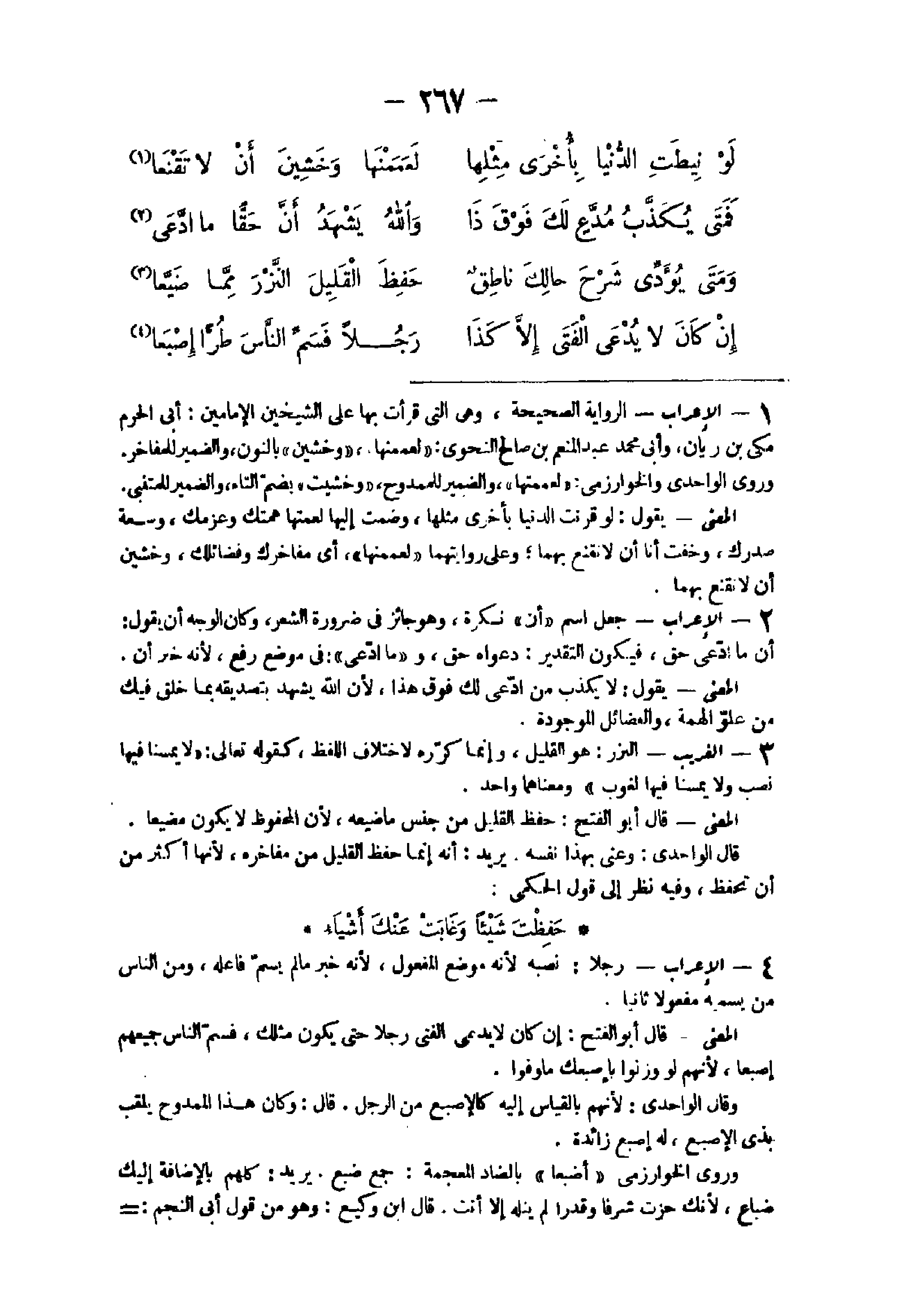 - الْإِعْرَاب الرِّوَايَة الصَّحِيحَة وهى الَّتِى قَرَأت بهَا على الشَّيْخَيْنِ الْإِمَامَيْنِ أَبى الْحرم مكى بن رَيَّان وأبى مُحَمَّد عبد الْمُنعم بن صَالح النحوى لعممنها وخشين بالنُّون وَالضَّمِير للمفاخر وروى الواحدى والخوارزمى لعممتها وَالضَّمِير للممدوح وخشيت بِضَم التَّاء وَالضَّمِير للمتنبى الْمَعْنى يَقُول لَو قرنت الدُّنْيَا بِأُخْرَى مثلهَا وضمت إِلَيْهَا لعمتها همتك وعزمك وسعة صدرك وَخفت أَنا أَن لَا نقنع بهما وعَلى روايتهما لعممنها أى مفاخرك وفضائلك وخشين أَن لَا تقنع بهما