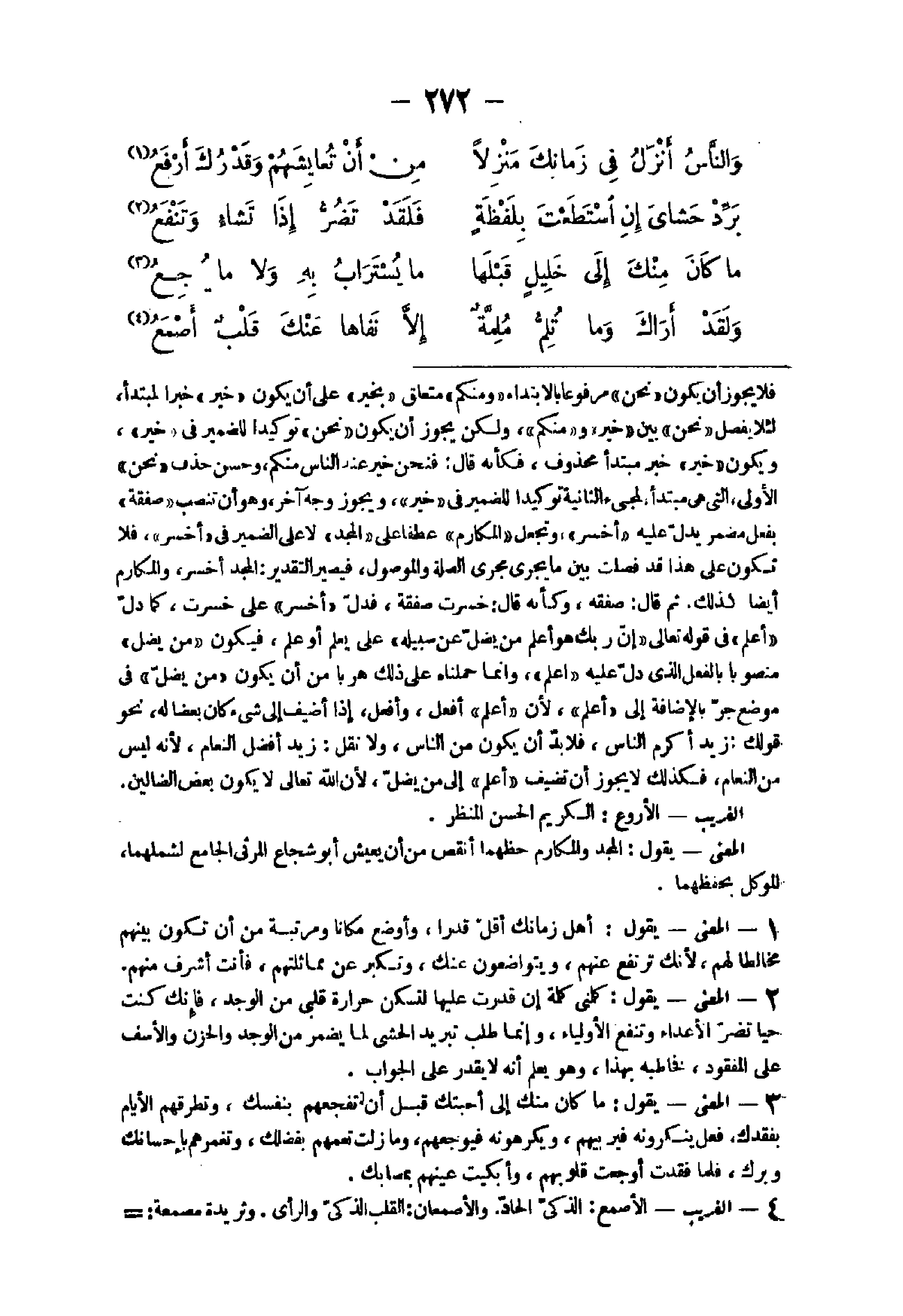 17 - الْغَرِيب الأصمع الذكى الحاد والأصمعان الْقلب الذكى والرأى وثريدة مصمعة إِذا كَانَ وَسطهَا نانئا والصومعة فوعلة مِنْهُ لِأَنَّهَا مُرْتَفعَة الْمَعْنى يَقُول كنت فى حَال حياتك مَا تنزل بك ملمة من الدَّهْر إِلَّا رَفعهَا عَنْك قلب ذكى وَلَا تعروك عَظِيمَة من الْأَمر إِلَّا نفى عَنْك مَا تحذر من ذَلِك قلب ذكى
