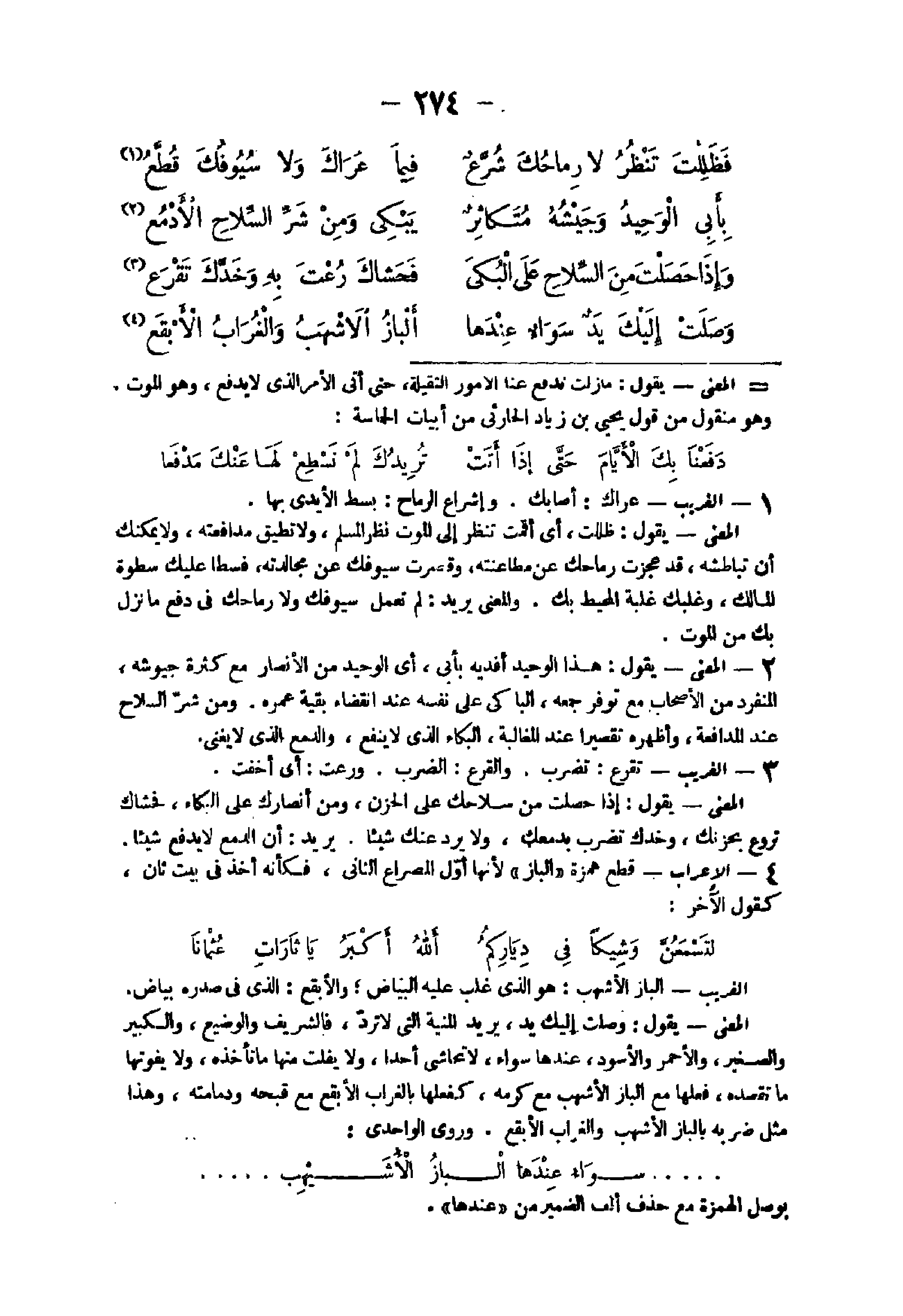 الْغَرِيب الباز الْأَشْهب هُوَ الذى غلب عَلَيْهِ الْبيَاض والأبقع الذى فى صَدره بَيَاض الْمَعْنى يَقُول وصلت إِلَيْك يَد يُرِيد الْمنية الَّتِي لَا ترد فالشريف والوضيع وَالْكَبِير وَالصَّغِير والأحمر وَالْأسود عِنْدهَا سَوَاء لَا تحاشي أحدا وَلَا يفلت مِنْهَا مَا تَأْخُذهُ وَلَا يفوتها مَا تقصده فعلهَا مَعَ الباز الْأَشْهب مَعَ كرمه كفعلها بالغربا الأبقع مَعَ قبحة ودمامته وَهَذَا مثل ضربه بالباز الْأَشْهب والغربا الأبقع وروى الواحدى