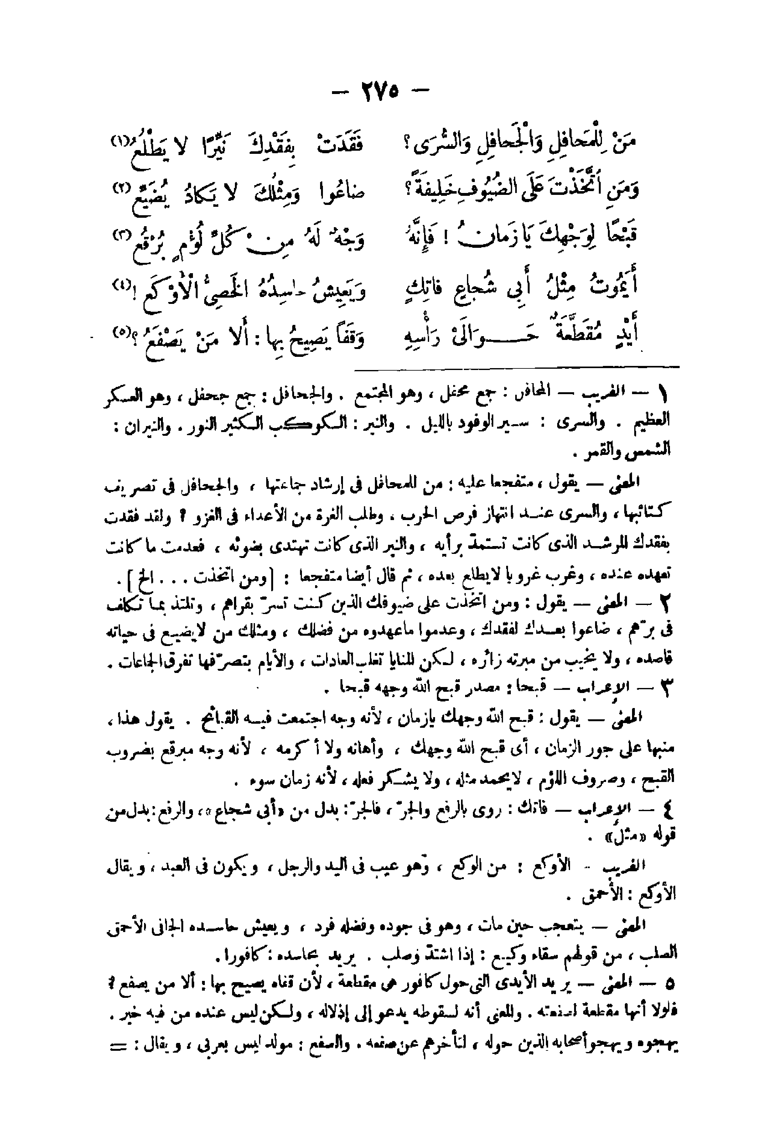 - الْغَرِيب المحافل جمع محفل وَهُوَ الْمُجْتَمع والجحافل جمع جحفل وَهُوَ الْعَسْكَر الْعَظِيم والسرى سير الْوُفُود بِاللَّيْلِ والنير الْكَوْكَب الْكثير النُّور والنيران الشَّمْس وَالْقَمَر الْمَعْنى يَقُول متفجعا عَلَيْهِ من للمحافل فى إرشاد جماعتها والجحافل فى تصريف كتائبها والسرى عِنْد انتهاز فرص الْحَرْب وَطلب الْغرَّة من الْأَعْدَاء فى الْغَزْو وَلَقَد فقدت بفقدك المرشد الذى كَانَت تستمد بِرَأْيهِ والنير الذى كَانَت تهتدى بضوئه فقد مت مَا كَانَت تعهده عِنْده وَغرب غروبا لَا يطلع بعده ثمَّ قَالَ أَيْضا مفجعا