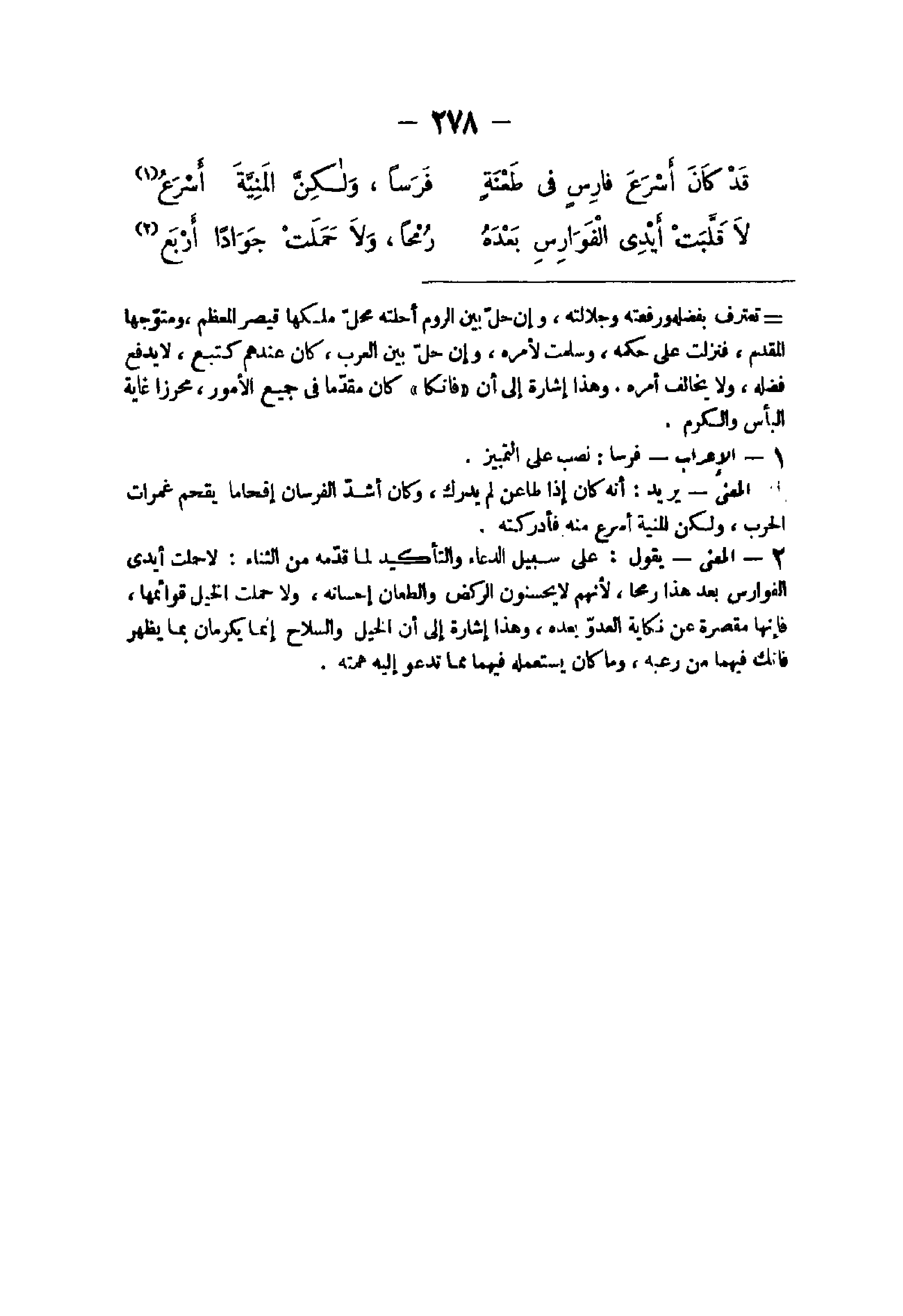 - الْإِعْرَاب فرسا نصب على التَّمْيِيز الْمَعْنى يُرِيد أَنه كَانَ إِذا طَاعن لم يدْرك وَكَانَ أَشد الفرسان إقحاما يقحم غَمَرَات الْحَرْب وَلَكِن الْمنية أسْرع مِنْهُ فَأَدْرَكته