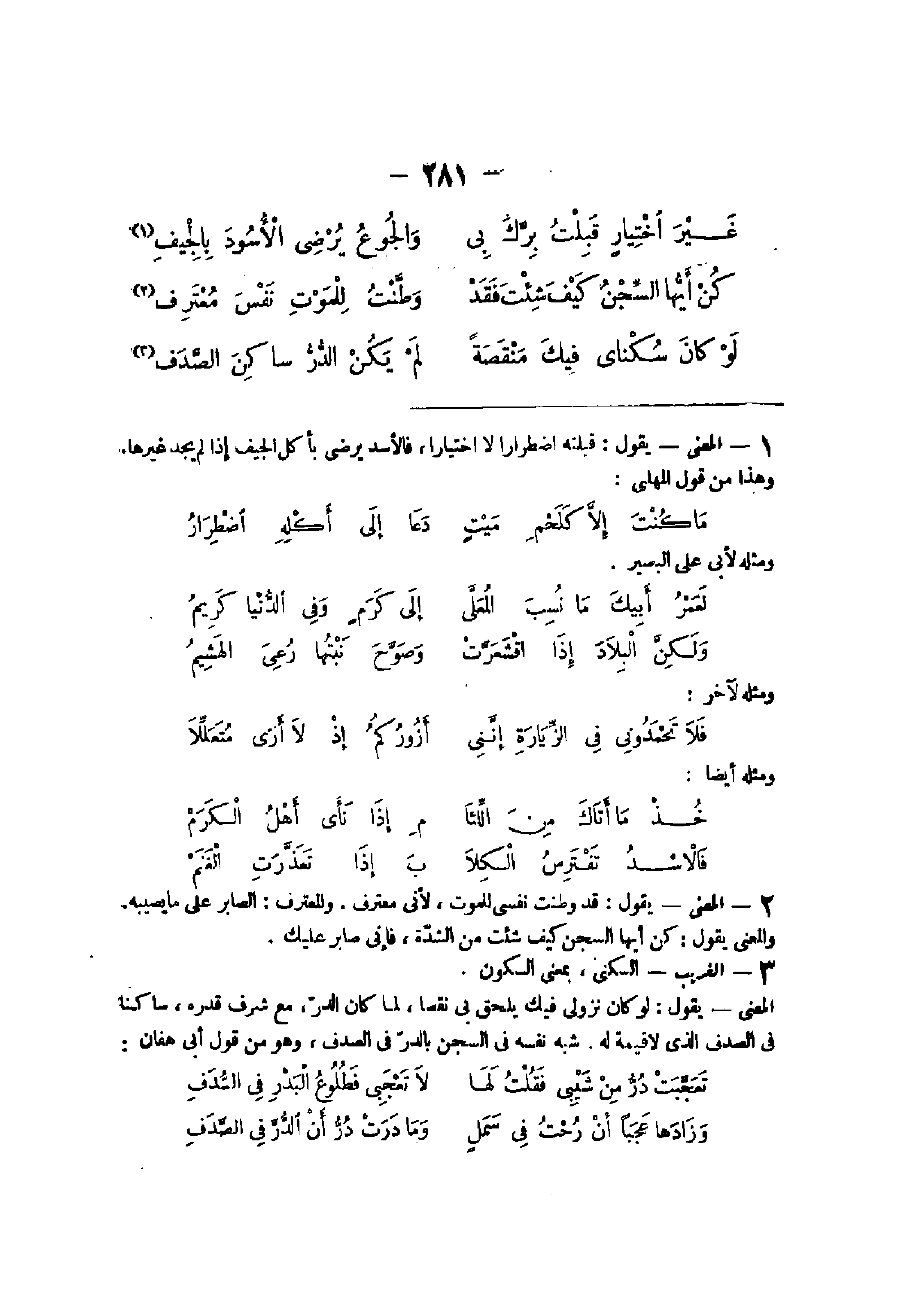 4 - الْغَرِيب السُّكْنَى بِمَعْنى السّكُون الْمَعْنى يَقُول لَو كَانَ نزولى فِيك يلْحق بى نقصا لما كَانَ الدّرّ مَعَ شرف قدره سَاكِنا فى الصدف الذى لَا قيمَة لَهُ شبه نَفسه فى السجْن بالدر فى الصدف وَهُوَ من قَول أَبى هفان