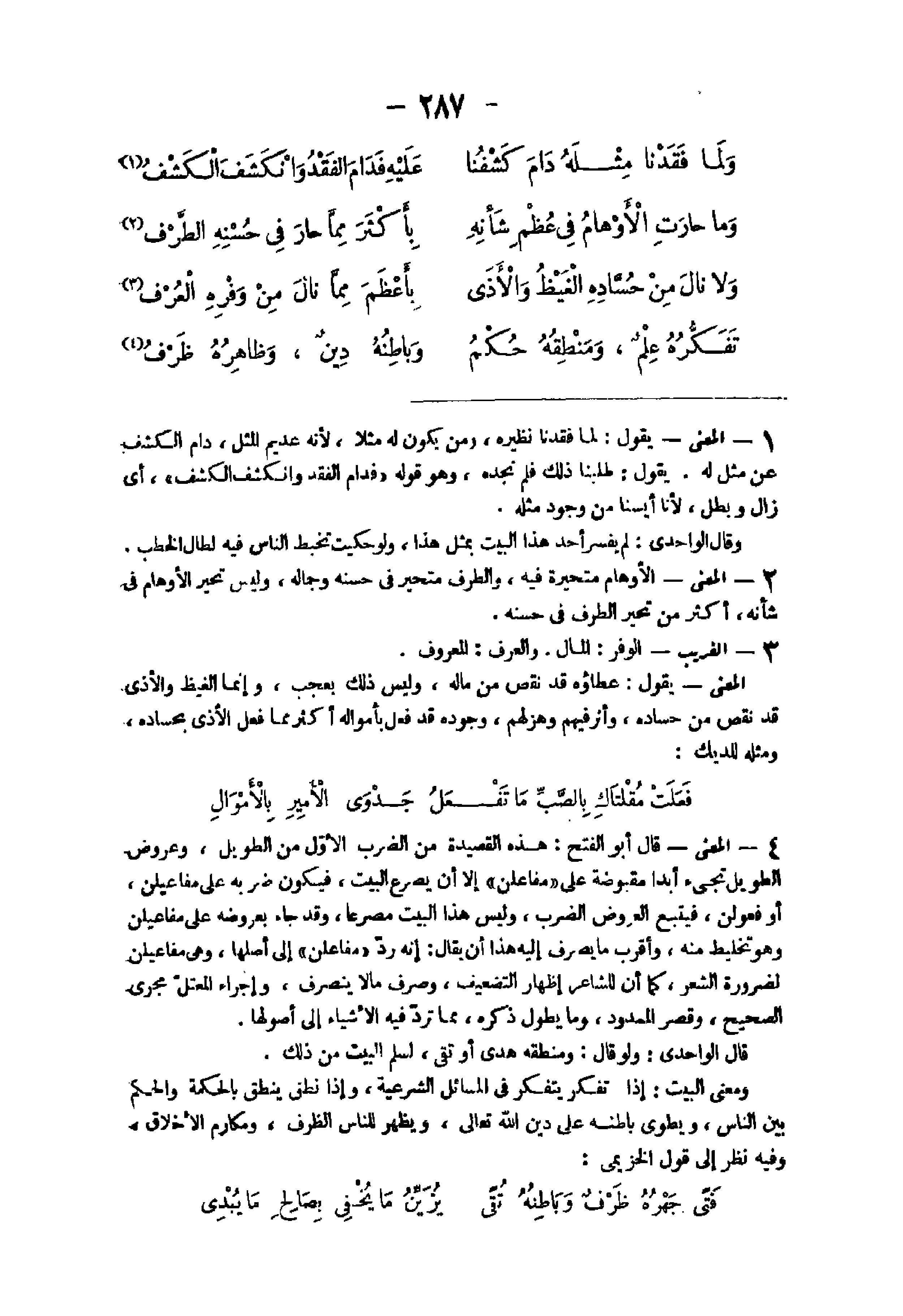23 - الْمَعْنى قَالَ أَبُو الْفَتْح هَذِه القصيدة من الضَّرْب الأول من الطَّوِيل وعروض الطَّوِيل تجئ أبدا مَقْبُوضَة على مفاعلن إِلَّا أَن يصرع الْبَيْت فَيكون ضربه على مفاعلين أَو فعولن فَيتبع الْعرُوض الضَّرْب وَلَيْسَ هَذَا الْبَيْت مصرعا وَقد جَاءَ بعروضه على مفاعيلن وَهُوَ تَخْلِيط مِنْهُ وَأقرب مَا يصرف إِلَيْهِ هَذَا أَن يُقَال إِنَّه رد مفاعلن إِلَى أَصْلهَا وهى مفاعيلن لضَرُورَة الشّعْر كَمَا أَن للشاعر إِظْهَار التَّضْعِيف وَصرف مَا لَا ينْصَرف وإجراء المعتل مجْرى الصَّحِيح وَقصر الْمَمْدُود وَمَا يطول ذكره مِمَّا ترد فِيهِ الْأَشْيَاء إِلَى أُصُولهَا قَالَ الواحدى وَلَو قَالَ ومنطقه هدى أَو تسقى لسلم الْبَيْت من ذَلِك وَمعنى الْبَيْت إِذا تفكر يتفكر فى الْمسَائِل الشَّرْعِيَّة وَإِذا نطق ينْطق بالحكمة وَالْحكم بَين النَّاس ويطوى بَاطِنه على دين الله تَعَالَى وَيظْهر للنَّاس الظّرْف وَمَكَارِم الْأَخْلَاق وَفِيه نظر إِلَى قَول الخريمى