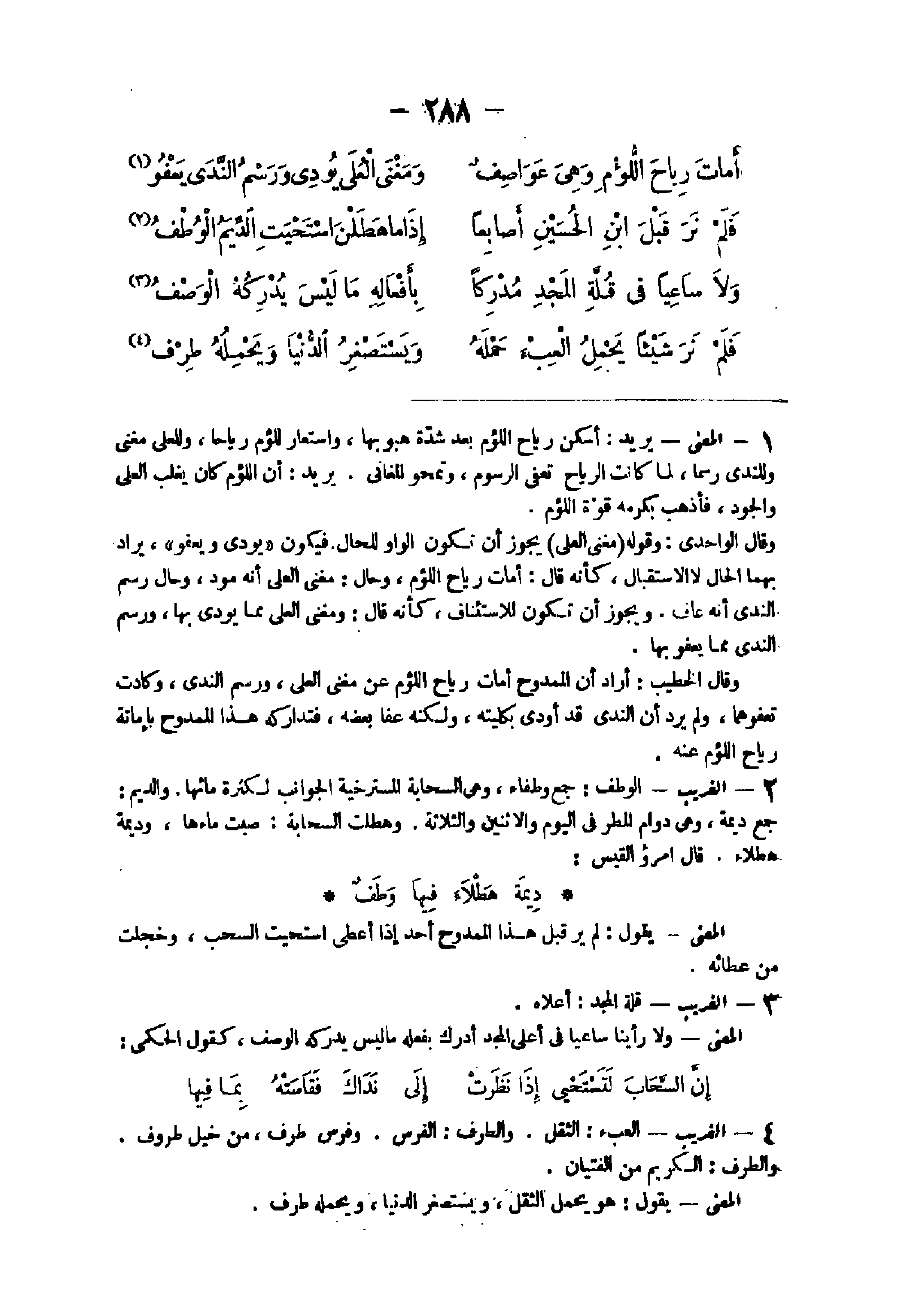 - الْمَعْنى يُرِيد أسكن ريَاح اللؤم بعد شدَّة هبوبها واستعار للؤم رياحا وللعلى مغنى وللندى رسما لما كَانَت الرِّيَاح تعفى الرسوم وتمحو المغانى يُرِيد أَن اللؤم كَانَ يغلب العلى والجود فَأذْهب بكرمه قُوَّة اللؤم وَقَالَ الواحدى وَقَوله مغنى العلى يجوز أَن تكون الْوَاو للْحَال فَيكون يودى وَيَعْفُو يُرَاد بهما الْحَال لَا الِاسْتِقْبَال كَأَنَّهُ قَالَ أمات ريَاح اللؤم وَحَال معنى العلى أَنه مود وَحَال رسم الندى أَنه عاف وَيجوز أَن تكون للاستئناف كَأَنَّهُ قَالَ ومغنى العلى مِمَّا يُؤدى بهَا ورسم الندى مِمَّا يعْفُو بهَا وَقَالَ الْخَطِيب أَرَادَ أَن الممدوح أمات ريَاح اللوم عَن مغنى الغلى ورسم الندى وكادت تعفوهما وَلم يرد أَن الندى قد أودى بكليته وَلكنه عَفا بعضه فَتَدَاركهُ هَذَا الممدوح فإماتة ريَاح اللوم عَنهُ