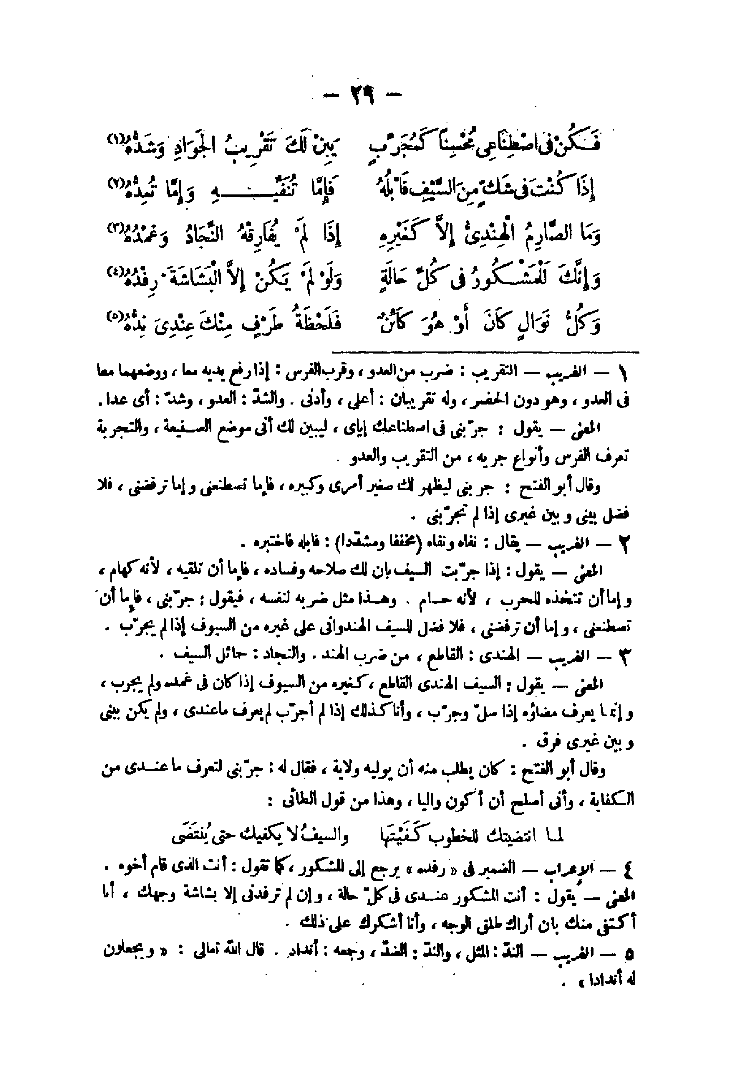 41 - الْغَرِيب يُقَال نَفَاهُ ونفاه مخففا ومشددا قابله فاختبره الْمَعْنى يَقُول إِذا جربت السَّيْف بَان لَك صَلَاحه وفساده فإمَّا أَن تلقيه لِأَنَّهُ كهام وَإِمَّا أَن تتخذه للحرب لِأَنَّهُ حسام وَهَذَا مثل ضربه لنَفسِهِ فَيَقُول جربنى فإمَّا أَن تصطنعنى وَإِمَّا أَن ترفضنى فَلَا فضل للسيف الهندوانى على غَيره من السيوف إِذا لم يجرب
