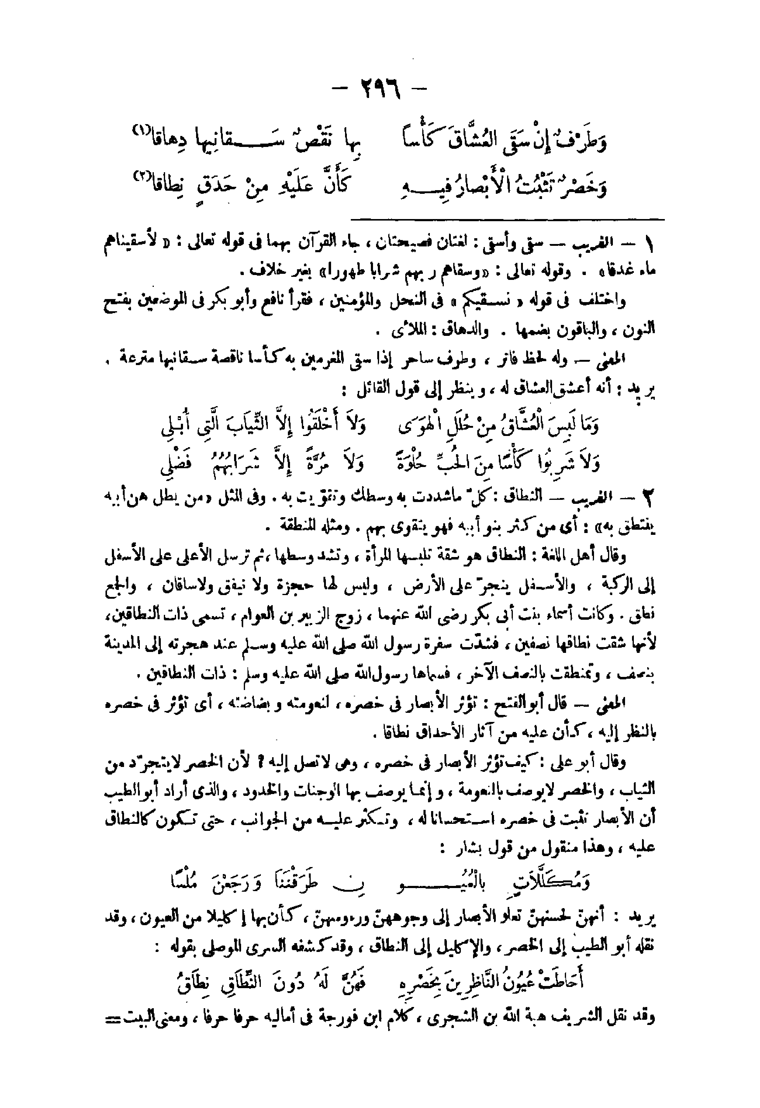 - الْغَرِيب سقى وأسقى لُغَتَانِ فصيحتان جَاءَ الْقُرْآن بهما فى قَوْله تَعَالَى {لأسقيناهم مَاء غدقا} وَقَوله تَعَالَى {وسقاهم رَبهم شراب طهُورا} بِغَيْر خلاف وَاخْتلف فى قَوْله {نسقيكم} فى النَّحْل وَالْمُؤمنِينَ فَقَرَأَ نَافِع وَأَبُو بكر فى الْمَوْضِعَيْنِ بِفَتْح الننون وَالْبَاقُونَ بضَمهَا والدهاق الملأى الْمَعْنى وَله لحظ فاتر وطرف سَاحر إِذا سقى المغرمين بِهِ كأسا ناقصه سقانيها مترعة يُرِيد أَنه أعشق العشاق لَهُ وَينظر إِلَى قَول الْقَائِل