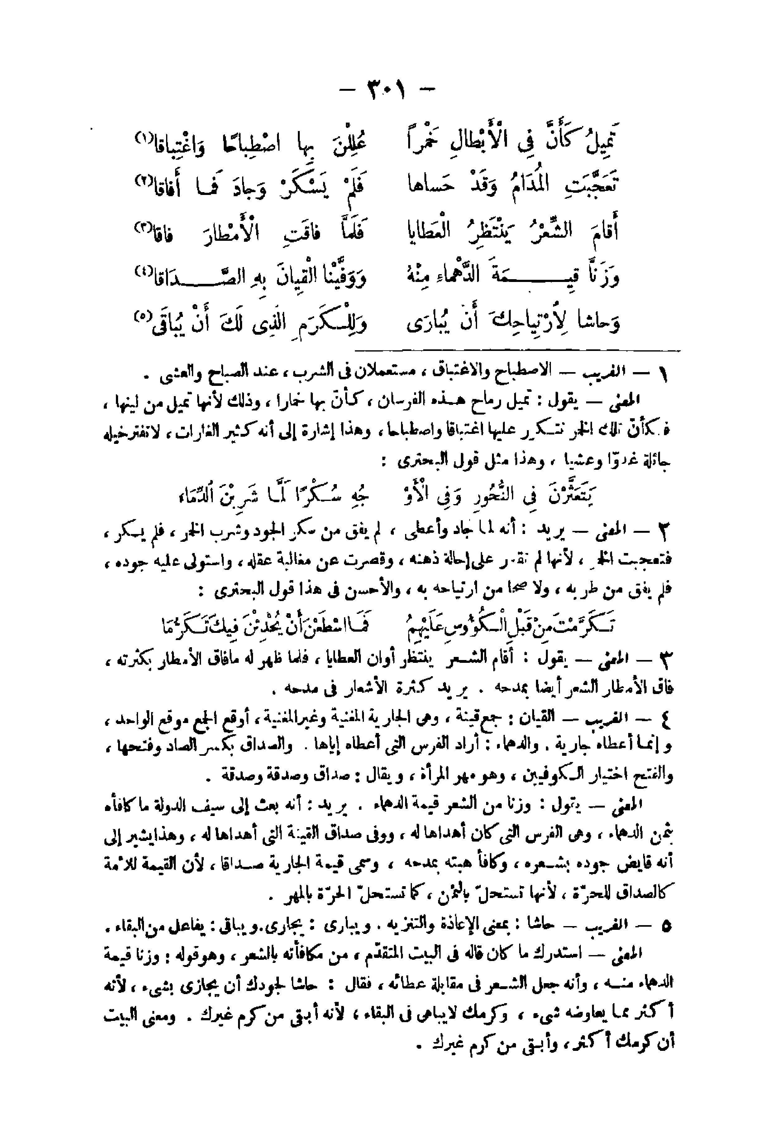 30 - الْغَرِيب حاشا بِمَعْنى الإعاذة والتنزيه ويبارى يجارى ويباقى يفاعل من الْبَقَاء الْمَعْنى استدرك مَا كَانَ قَالَه فى الْبَيْت الْمُتَقَدّم من مكافاته بالشعر وَهُوَ قَوْله وزنا قيمَة الدهماء مِنْهُ وَأَنه جعل الشّعْر فى مُقَابلَة عطائه فَقَالَ حاشا لجودك أَن يجازى بشئ لِأَنَّهُ أَكثر مِمَّا يعاوضه شئ وكرمك لَا يباهى فى الْبَقَاء لِأَنَّهُ أبقى من كرم غَيْرك وَمعنى الْبَيْت أَن كرمك أَكثر وَأبقى من كرم غَيْرك