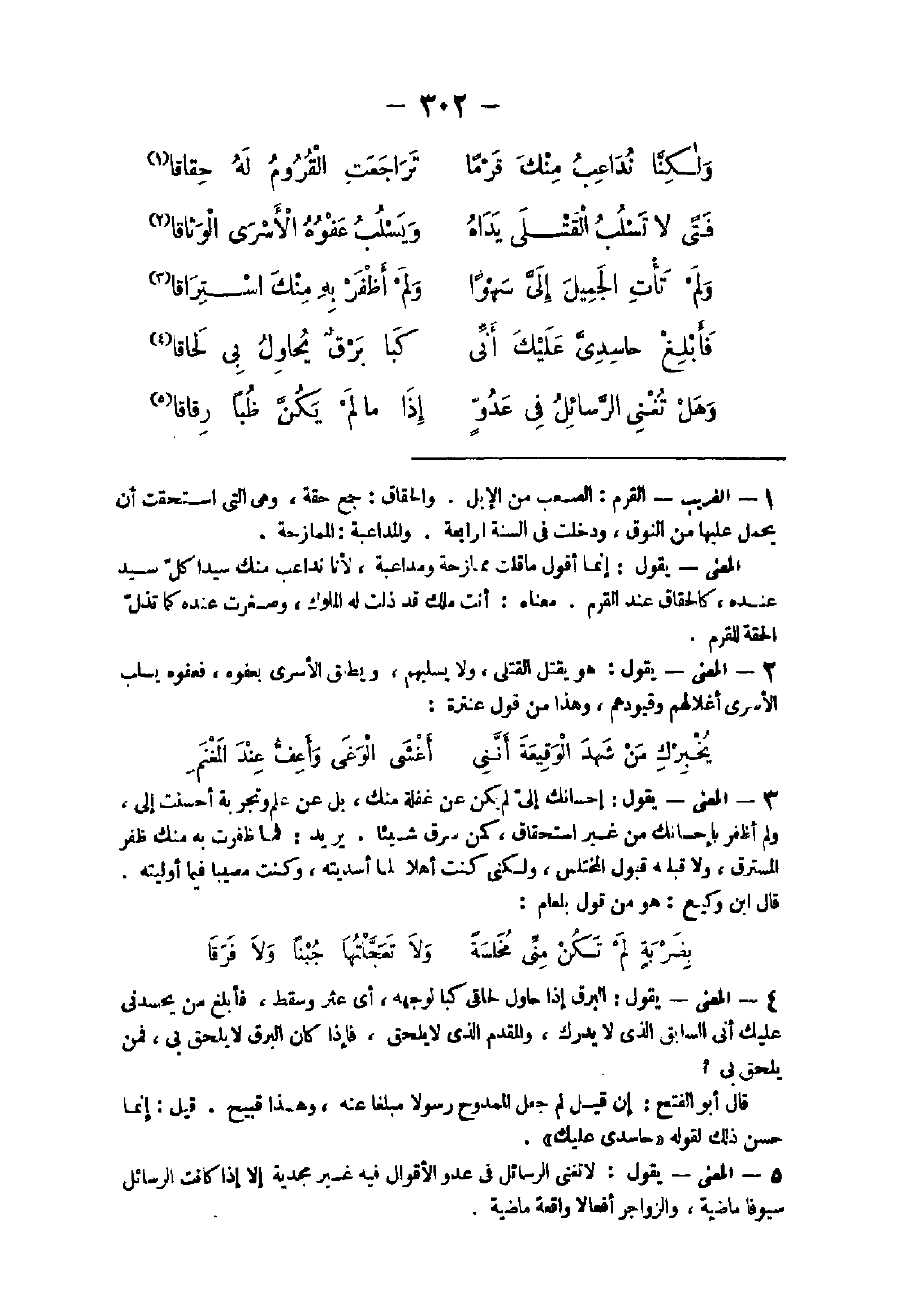 - الْغَرِيب القرم الصعب من الْإِبِل والحقاق جمع حقة وهى الَّتِى اسْتحقَّت أَن يحمل عَلَيْهَا من النوق وَدخلت فى السّنة الرَّابِعَة والمداعبة الممازحة الْمَعْنى يَقُول إِنَّمَا أَقُول مَا قلت ممازحة وملاعبة لأَنا نداعب مِنْك سيدا كل سيد عِنْده كالحقاق عِنْد القرم مَعْنَاهُ أَنْت ملك قد ذلت لَهُ الْمُلُوك وصغرت عِنْده كَمَا تذل الحقة للقرم