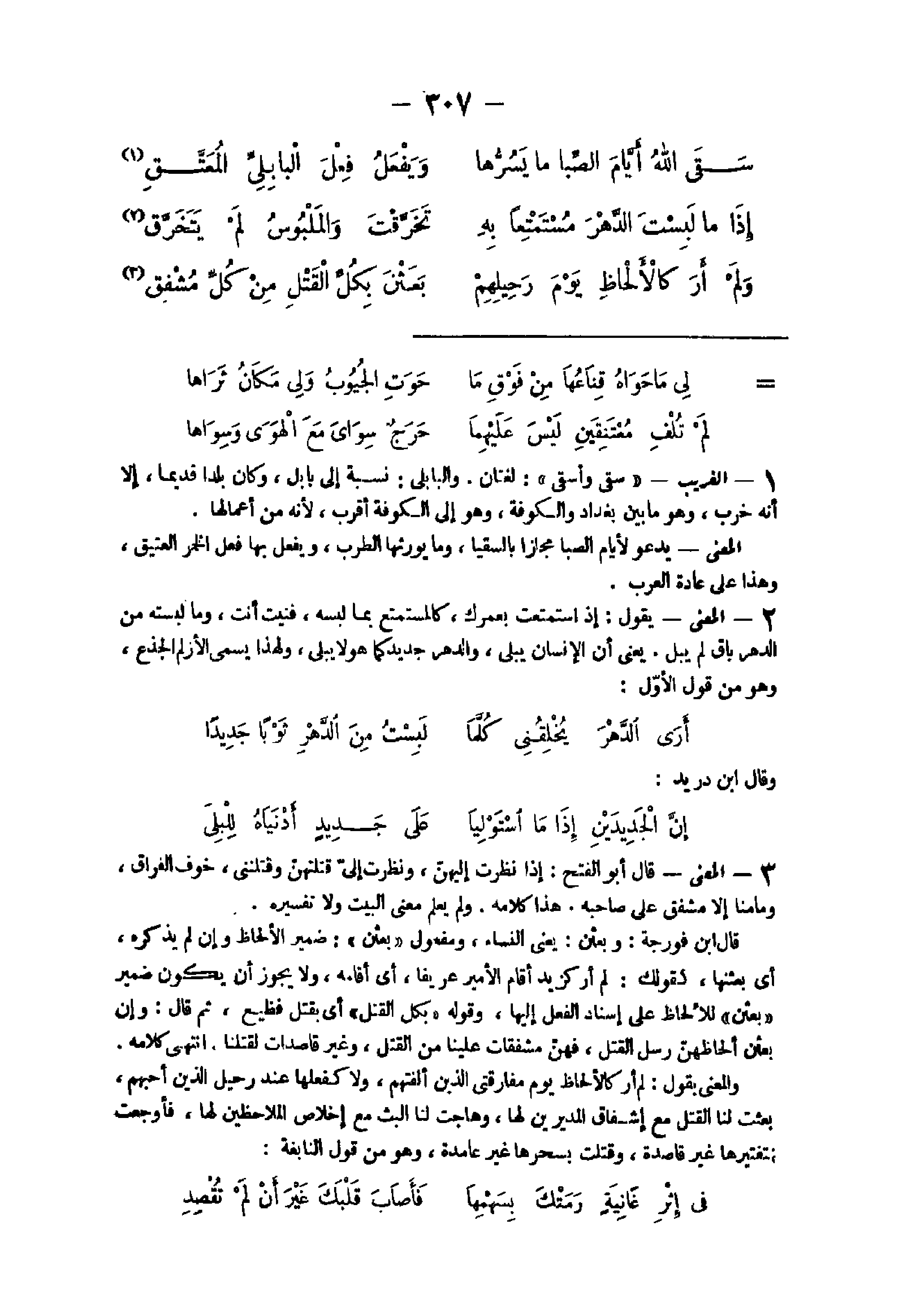 - الْغَرِيب سقى وأسقى لُغَتَانِ والبابلى نِسْبَة إِلَى بابل وَكَانَ بَلَدا قَدِيما إِلَّا أَنه خرب وَهُوَ مَا بَين بَغْدَاد والكوفة وَهُوَ إِلَى الْكُوفَة أقرب لِأَنَّهُ من أَعمالهَا الْمَعْنى يَدْعُو لأيام الصِّبَا مجَازًا بالسقيا وَمَا يُورثهَا الطَّرب وَيفْعل بهَا فعل الْخمر الْعَتِيق وَهَذَا على عَادَة الْعَرَب