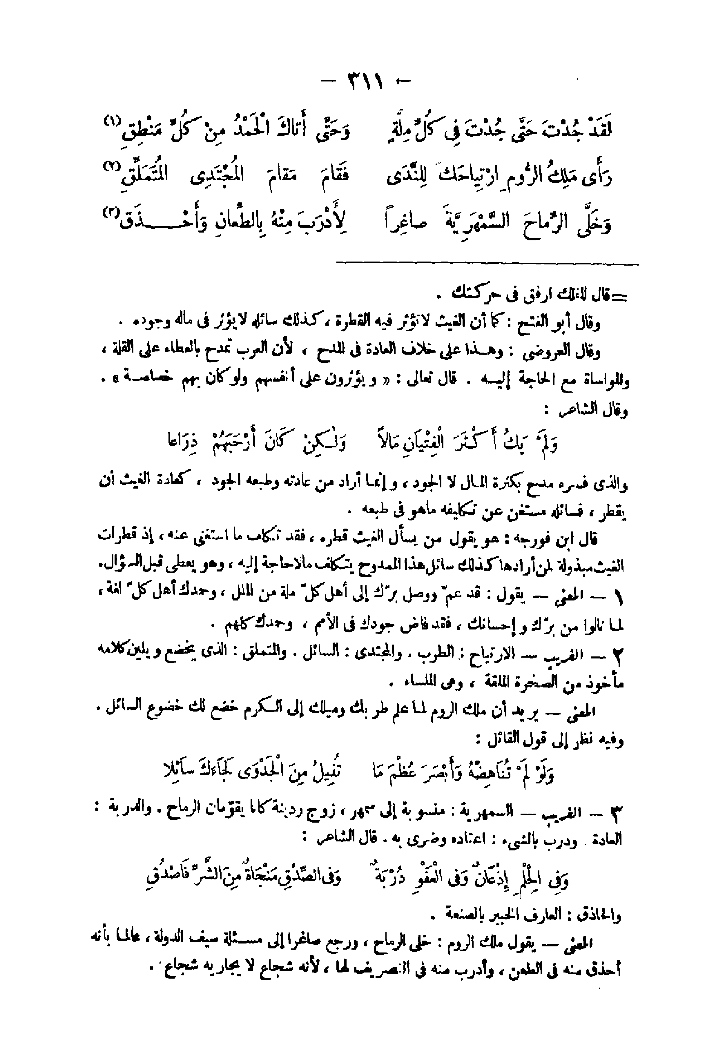 24 - الْغَرِيب الارتياح الطَّرب والمجتدى السَّائِل والمتملق الذى يخضع ويلين كَلَامه مَأْخُوذ من الصَّخْرَة الملقة وهى الملساء الْمَعْنى يُرِيد أَن ملك الرّوم لما علم طربك وميلك إِلَى الْكَرم خضع لَك خضوع السَّائِل وَفِيه نظر إِلَى قَول الْقَائِل