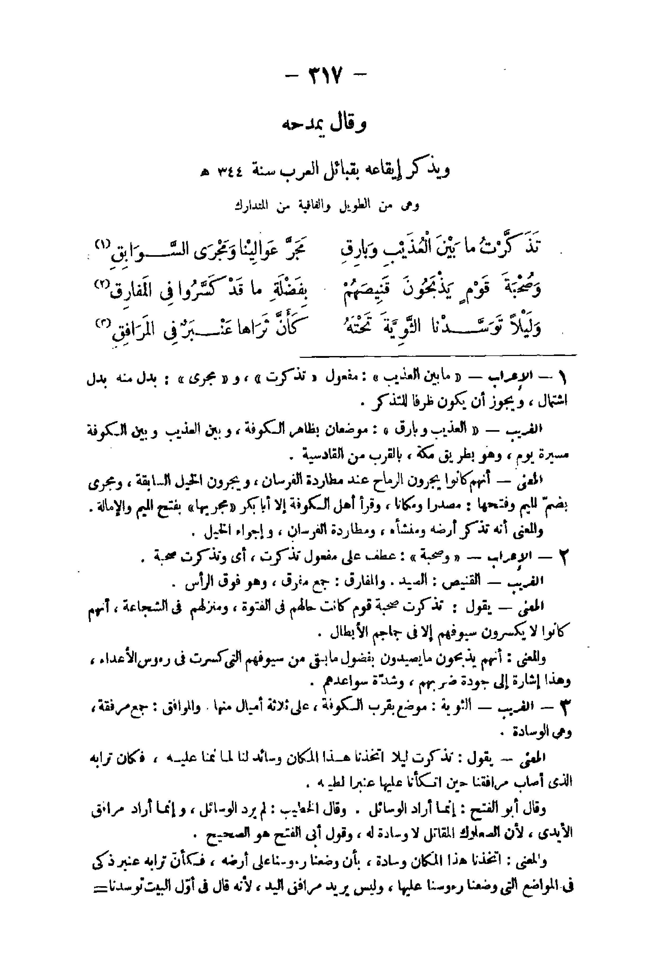 3 - الْغَرِيب الثوية مَوضِع بِقرب الْكُوفَة على ثَلَاثَة أَمْيَال مِنْهَا والمرافق جمع مرفقة وهى الوسادة الْمَعْنى يَقُول تذكرت لَيْلًا اتخذنا هَذَا الْمَكَان وسائد لنا لما نمنا عَلَيْهِ فَكَانَ ترابه الذى أصَاب مرافقنا حِين اتكأنا عَلَيْهَا عنبرا لطيبه وَقَالَ أَبُو الْفَتْح إِنَّمَا أَرَادَ الوسائد وَقَالَ الْخَطِيب لم يرد الوسائد وَإِنَّمَا أَرَادَ مرافق الأيدى لِأَن الصعلوك الْمقَاتل لَا وسَادَة لَهُ وَقَول أَبى الْفَتْح هُوَ // الصَّحِيح // وَالْمعْنَى اتخذنا هَذَا الْمَكَان وسَادَة بِأَن وَضعنَا رءوسنا على أرضه فَكَأَن ترابه عنبر ذكى فى الْمَوَاضِع الَّتِى وَضعنَا رءوسنا عَلَيْهَا وَلَيْسَ يُرِيد مرافق الْيَد لِأَنَّهُ قَالَ فى أول الْبَيْت توسدنا الثوية فَلَو حملنَا الْكَلَام على مَا قَالَه الْخَطِيب الذى رد بِهِ على أَبى الْفَتْح لَكَانَ عجز الْبَيْت ناقضا للصدر وَقَالَ العروضى أَلا ينظر أَبُو الْفَتْح إِلَى قَوْله