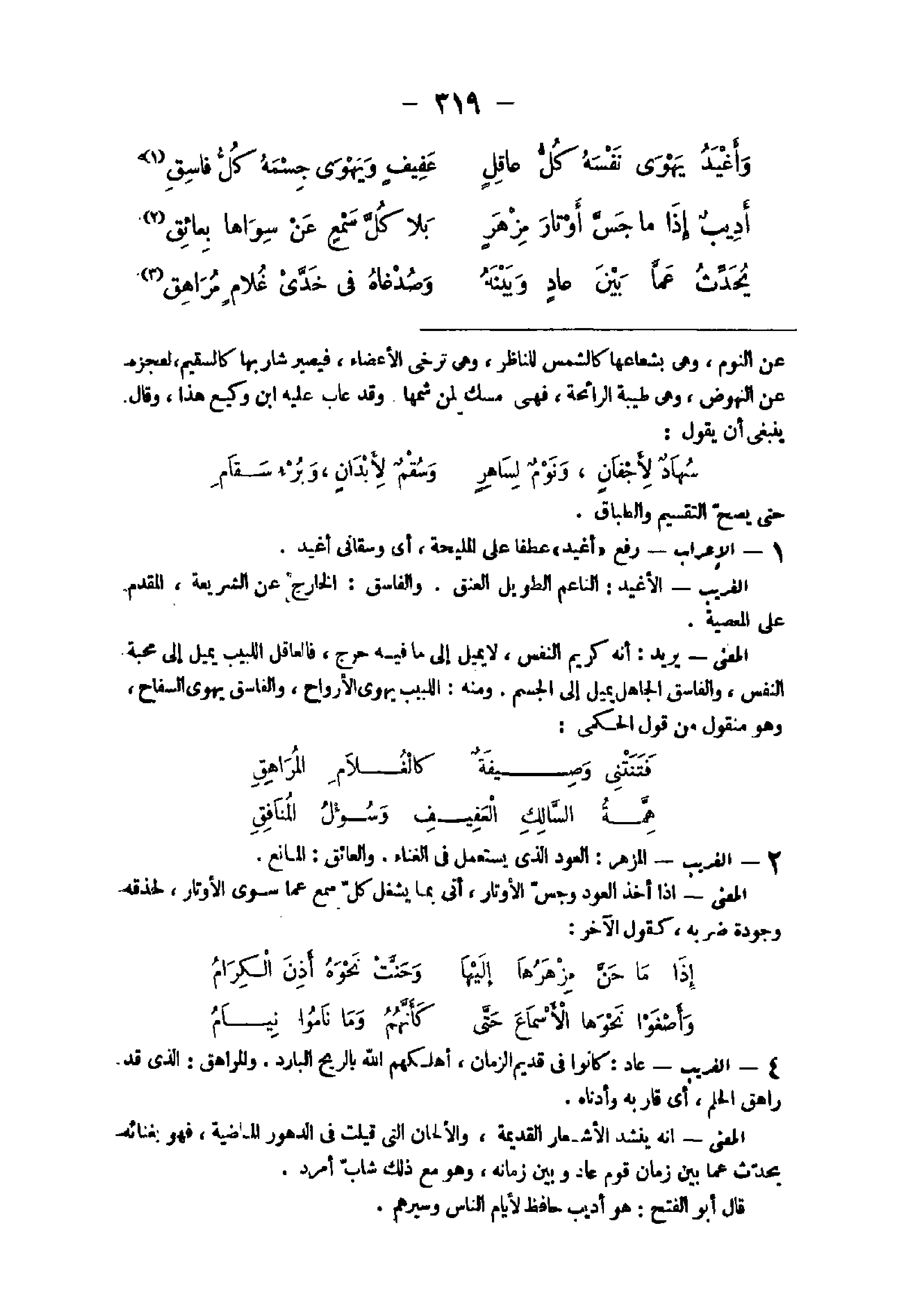 - الْإِعْرَاب رفع أغيد عطفا على المليحة أى وسقانى أغيد الْغَرِيب الأغيد الناعم الطَّوِيل الْعُنُق وَالْفَاسِق الْخَارِج عَن الشَّرِيعَة الْمُقدم على الْمعْصِيَة الْمَعْنى يُرِيد أَنه كريم النَّفس لَا يمِيل إِلَيْهِ مَا فِيهِ حرج فالعاقل اللبيب يمِيل إِلَى محبَّة النَّفس وَالْفَاسِق الْجَاهِل يمِيل إِلَى الْجِسْم وَمِنْه اللبيب يهوى الْأَرْوَاح وَالْفَاسِق يهوى السفاح وَهُوَ مَنْقُول من قَول الحكمى