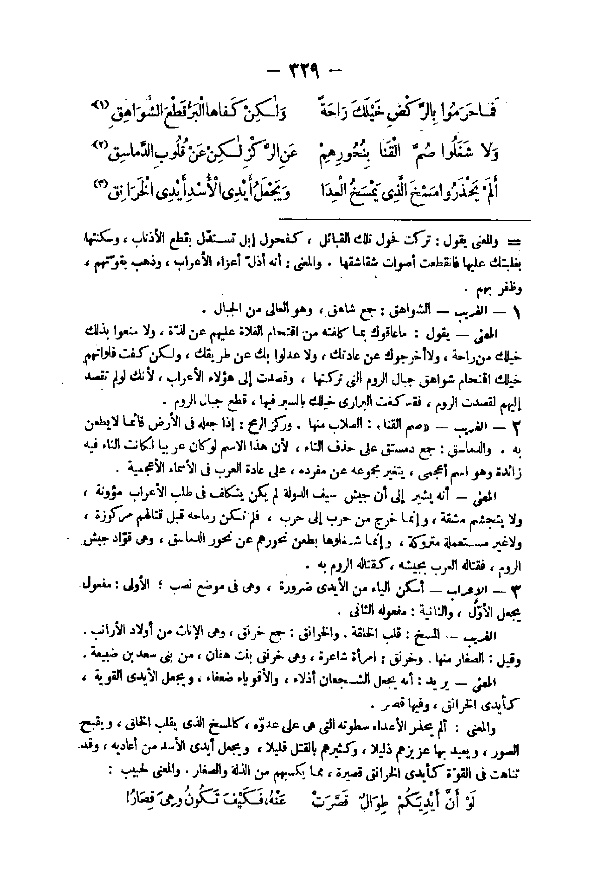 - الْغَرِيب الشواهق جمع شَاهِق وَهُوَ العالى من الْجبَال الْمَعْنى يَقُول مَا عاقوك بِمَا كلفته من اقتحام الفلاة عَلَيْهِم عَن لَذَّة وَلَا منعُوا بذلك خيلك من رَاحَة وَلَا أخرجوك عَن عادتك وَلَا عدلوا بك عَن طريقك وَلَكِن كفت فلواتهم خيلك اقتحام شَوَاهِق جبال الرّوم الَّتِى تركتهَا وقصدت إِلَى هَؤُلَاءِ الْأَعْرَاب لِأَنَّك لَو لم تقصد إِلَيْهِم لقصدت الرّوم فقد كفت البرارى خيلك بالسير فِيهَا قطع جبال الرّوم