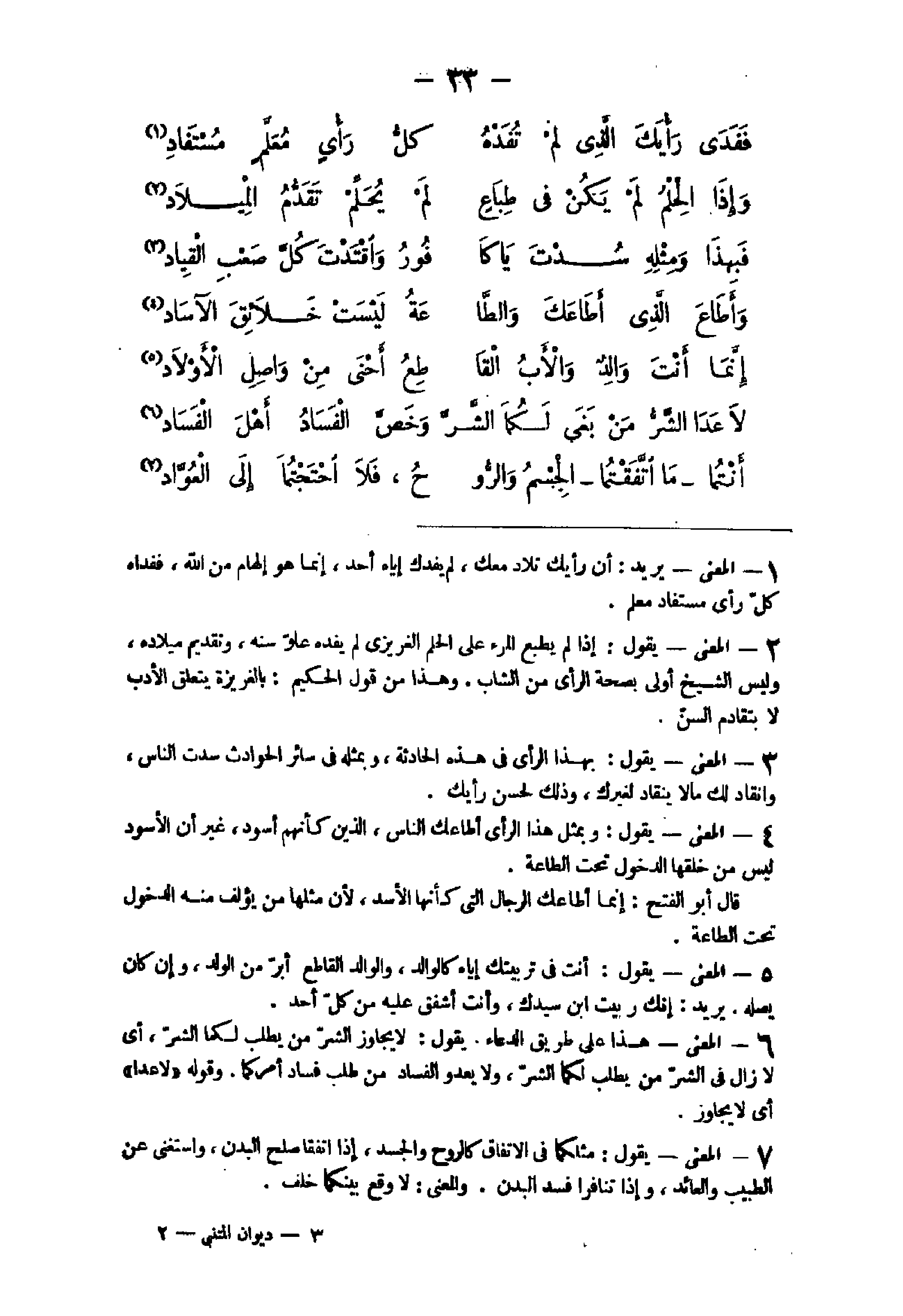 5 - الْمَعْنى يَقُول إِذا لم يطبع الْمَرْء على الْحلم الغريزى لم يفده علو سنه وَتَقْدِيم ميلاده وَلَيْسَ الشَّيْخ أولى بِصِحَّة الرأى من الشَّاب وَهَذَا من قَول الْحَكِيم بالغريزة يتَعَلَّق الْأَدَب بتقادم السن