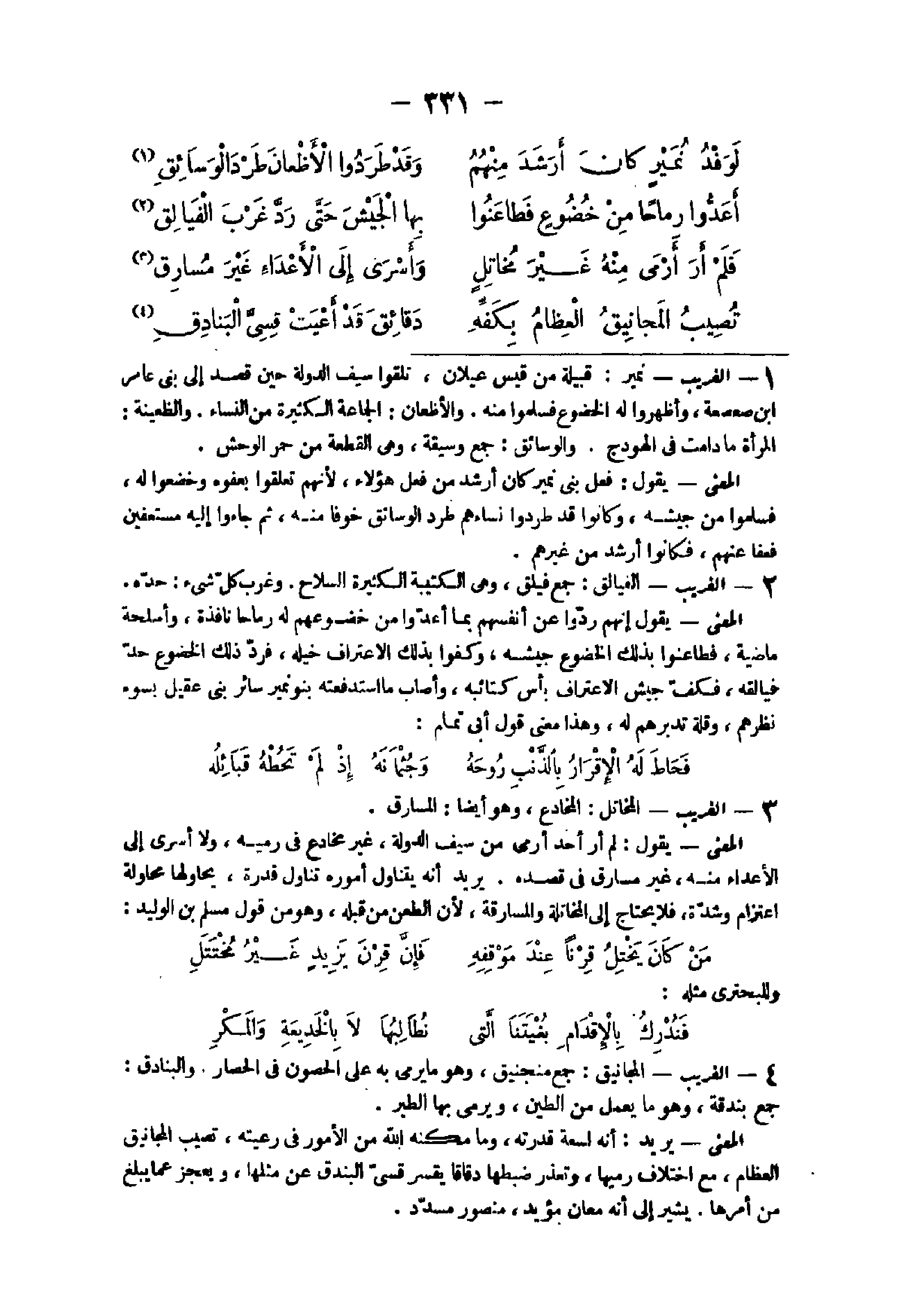 - الْغَرِيب نمير قَبيلَة من قيس عيلان تلقوا سيف الدولة حِين قصد إِلَى بنى عَامر ابْن صعصعة وأظهروا لَهُ الخضوع فَسَلمُوا مِنْهُ والأظعان الْجَمَاعَة الْكَثِيرَة من النِّسَاء والظعينة الْمَرْأَة مَا دَامَت فى الهودج والوسائق جمع وسيقه وهى الْقطعَة من حمر الْوَحْش الْمَعْنى يَقُول فعل ابْن نمير كَانَ أرشد من فعل هَؤُلَاءِ لأَنهم تعلقوا بعفوه وخضعوا لَهُ فَسَلمُوا من جَيْشه وَكَانُوا قد طردوا نِسَاءَهُمْ طرد الوسائق خوفًا مِنْهُ ثمَّ جَاءُوا إِلَيْهِ مستعفين فَعَفَا عَنْهُم فَكَانُوا أرشد من غَيرهم