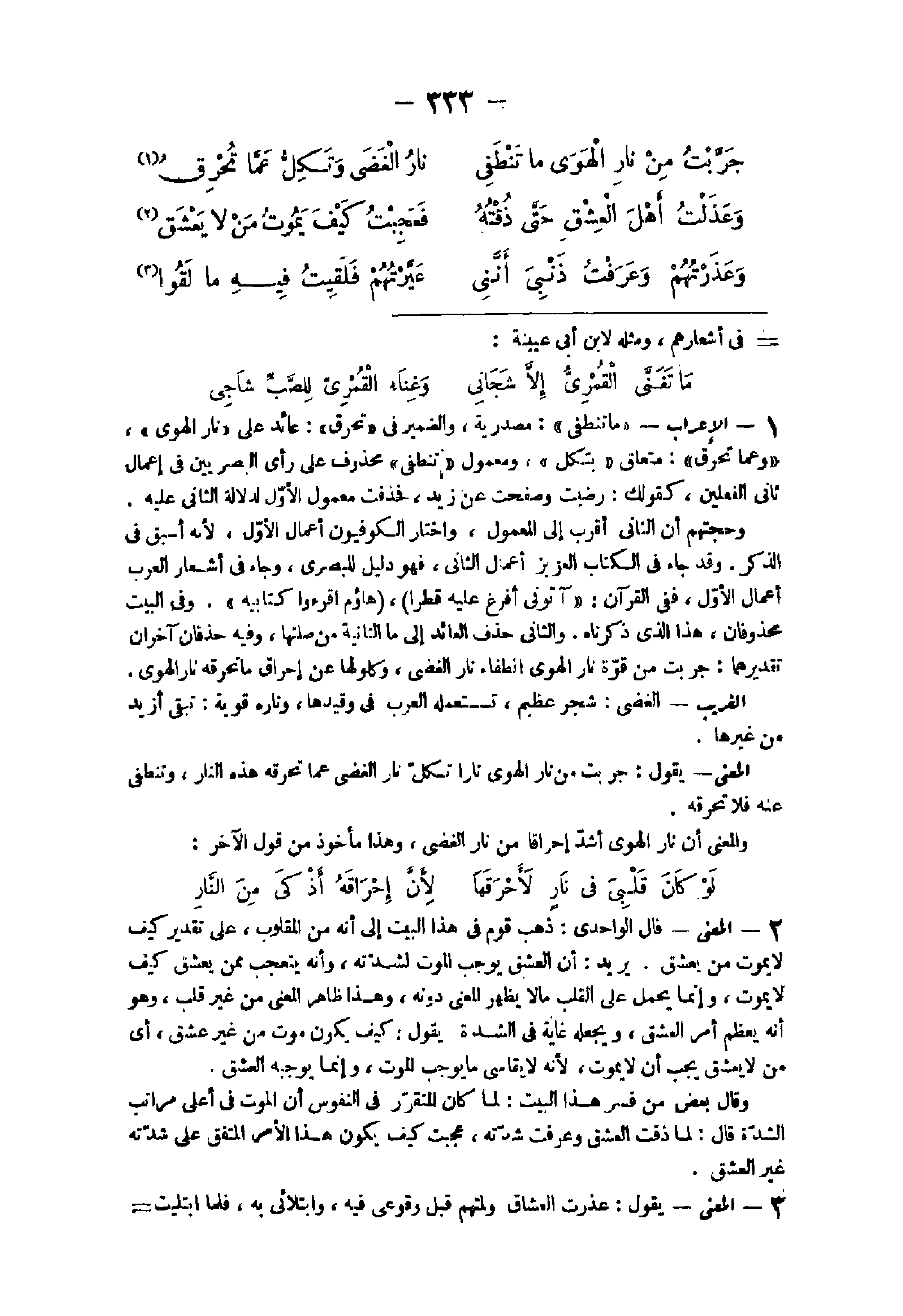 - الْإِعْرَاب مَا تنطقى مَصْدَرِيَّة وَالضَّمِير فى تحرق عَائِد على نَار الْهوى وَعَما تحرق مُتَعَلق بتكل ومعمول تنطفى مَحْذُوف على رأى الْبَصرِيين فى إِعْمَال ثانى الْفِعْلَيْنِ كَقَوْلِك رضيت وصفحت عَن زيد فحذفت مَعْمُول الأول لدلَالَة الثانى عَلَيْهِ وحجتهم أَن الثانى أقرب إِلَى الْمَعْمُول وَاخْتَارَ الْكُوفِيُّونَ إِعْمَال الأول لِأَنَّهُ أسبق فى الذّكر وَقد جَاءَ فى الْكتاب الْعَزِيز إِعْمَال الثانى فَهُوَ دَلِيل للبصرى وَجَاء فى أشعار الْعَرَب إِعْمَال الأول ففى الْقُرْآن {آتوني أفرغ عَلَيْهِ قطرا} {هاؤم اقْرَءُوا كِتَابيه} وفى الْبَيْت محذوفان هَذَا الذى ذَكرْنَاهُ والثانى حذف الْعَائِد إِلَى مَا الثَّانِيَة من صلتها وَفِيه حذفان آخرَانِ تقديرهما جربت من قُوَّة نَار الْهوى انطفاء نَار الغضى وكلو لَهَا عَن إحراق مَا تحرقه نَار الْهوى الْغَرِيب الغضى شجر عَظِيم تستعمله الْعَرَب فى وقيدها وناره قَوِيَّة تبقى أَزِيد من غَيرهَا الْمَعْنى يَقُول جربت من نَارا الْهوى تكل الغضى عَمَّا تحرقه هَذِه النَّار وتنطفى عَنهُ فَلَا تحرقه وَالْمعْنَى أَن نَار الْهوى أَشد إحراقا من نَار الغضى وَهَذَا مَأْخُوذ من قَول الآخر