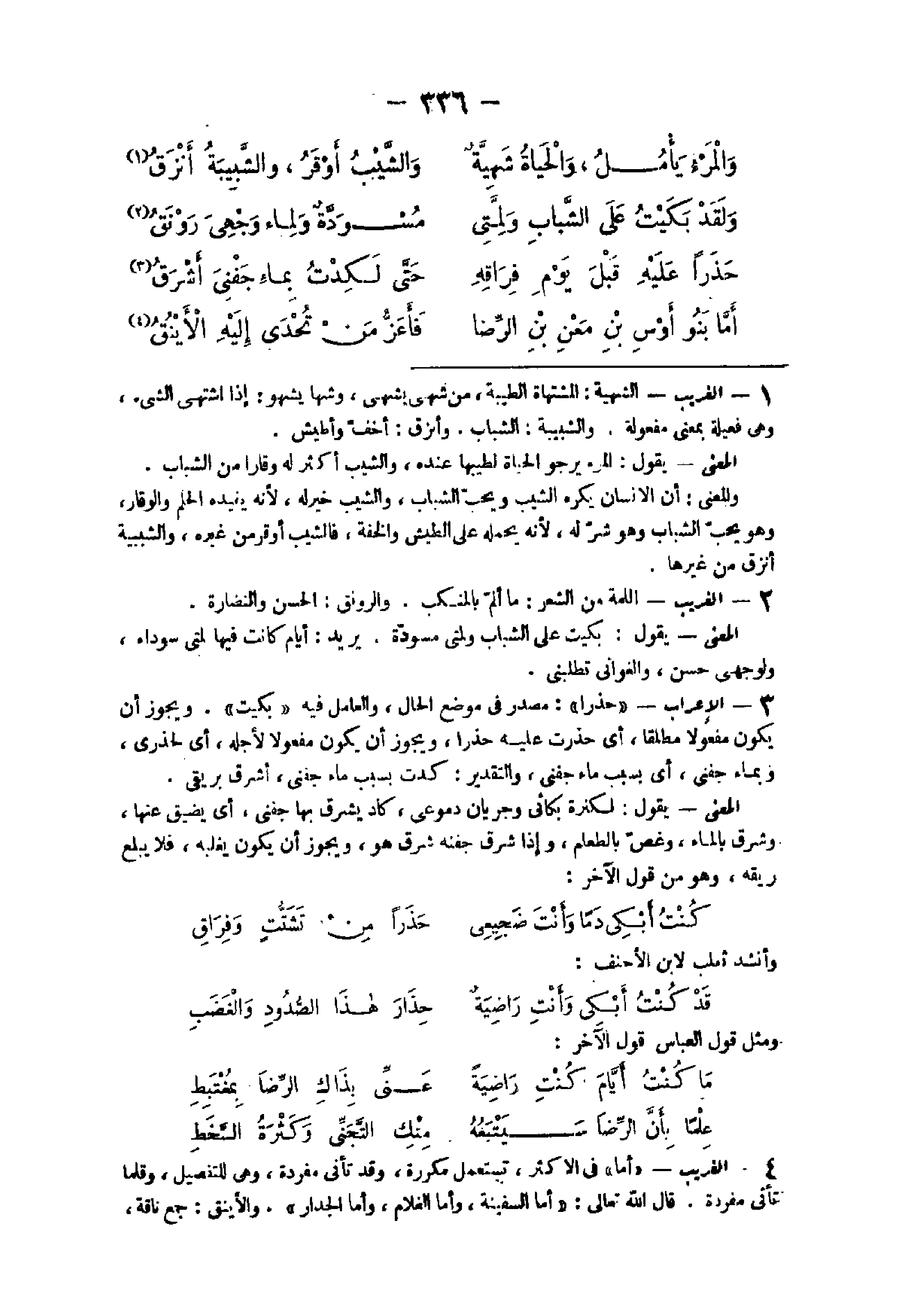 14 - الْغَرِيب اللمة من الشّعْر مَا ألم بالمنكب والرونق الْحسن والنضارة الْمَعْنى يَقُول بَكَيْت على الشَّبَاب ولمتى مسودة يُرِيد أَيَّام كَانَت فِيهَا لمتى سَوْدَاء ولوجها حسن والغوانى تطلبنى