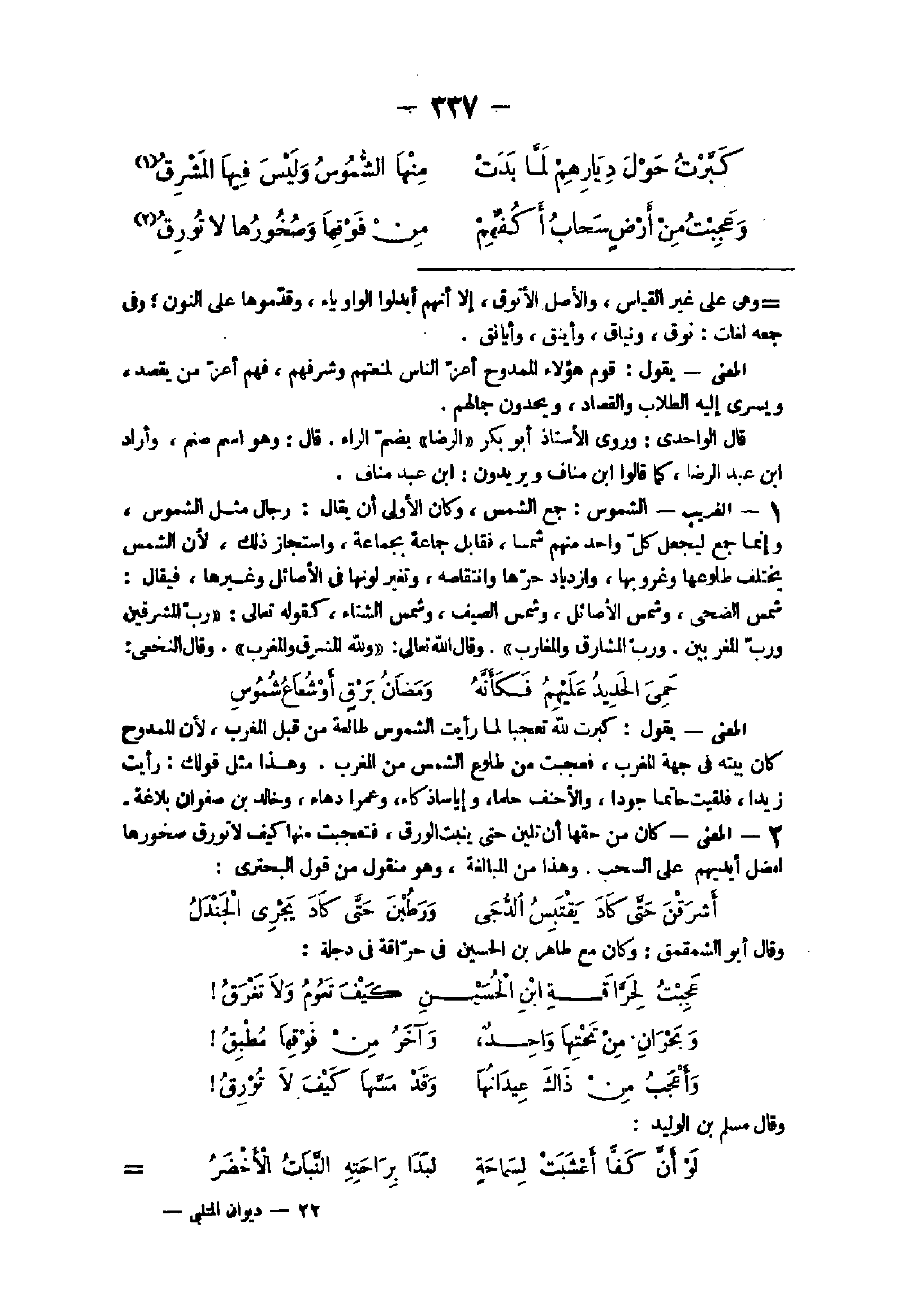 الْمَعْنى يَقُول كَبرت لله تَعَجبا لما رَأَيْت الشموس طالعة من قبل الْمغرب لِأَن الممدوح كَانَ بَيته فى جِهَة الْمغرب فعجبت من طُلُوع الشَّمْس من الْمغرب وَهَذَا مثل قَوْلك رَأَيْت زيدا فَلَقِيت حاتما جودا والأحنف حلما وإياسا ذكاء وعمرا دهاء وخَالِد بن صَفْوَان بلاغة